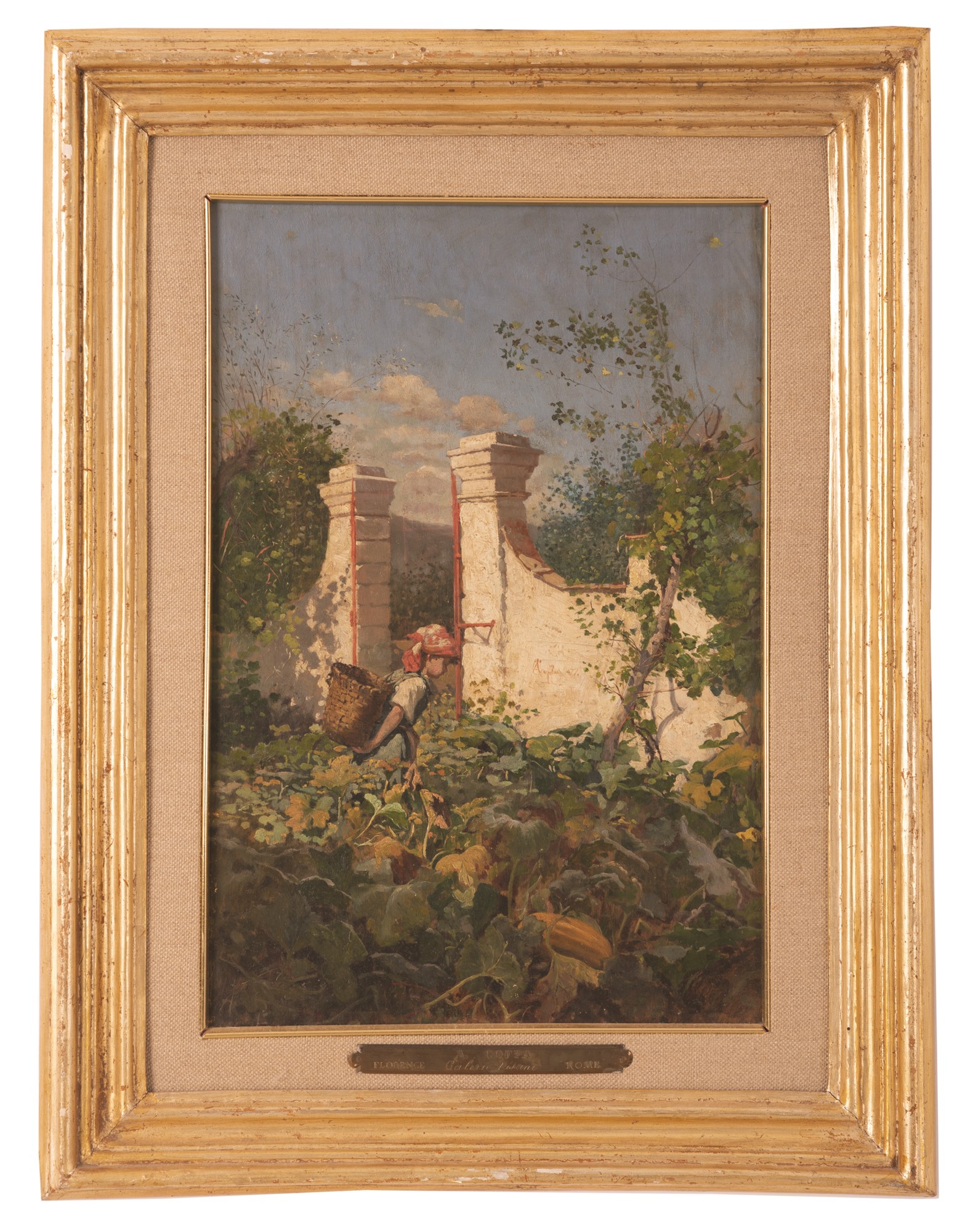 Coffa Andrea (Palermo , 1840 - Palermo , 1890 ) La raccolta delle zucche Olio su tela cm 48x32; con cornice cm 65x50