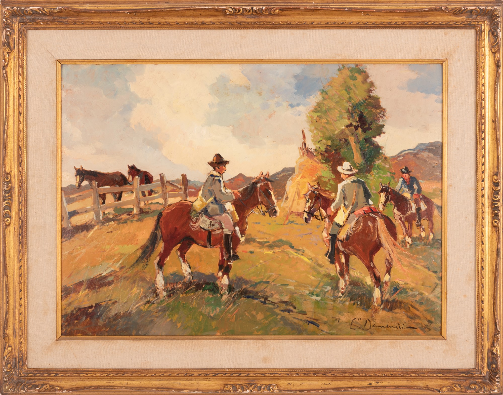 Carlo Domenici (Livorno, 1897 - Portoferraio, 1981) Scena campestre con cavalli e cavalieri olio su tela cm 50x70