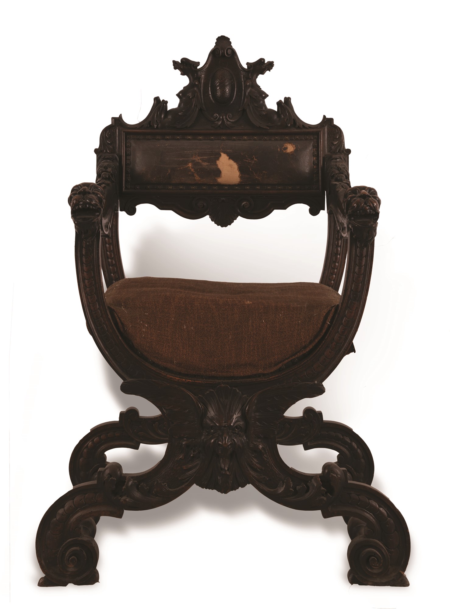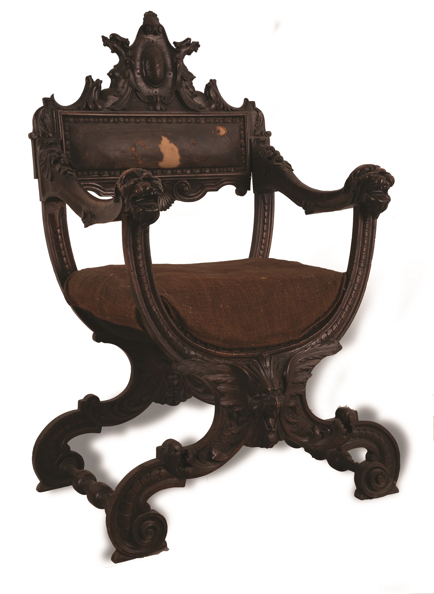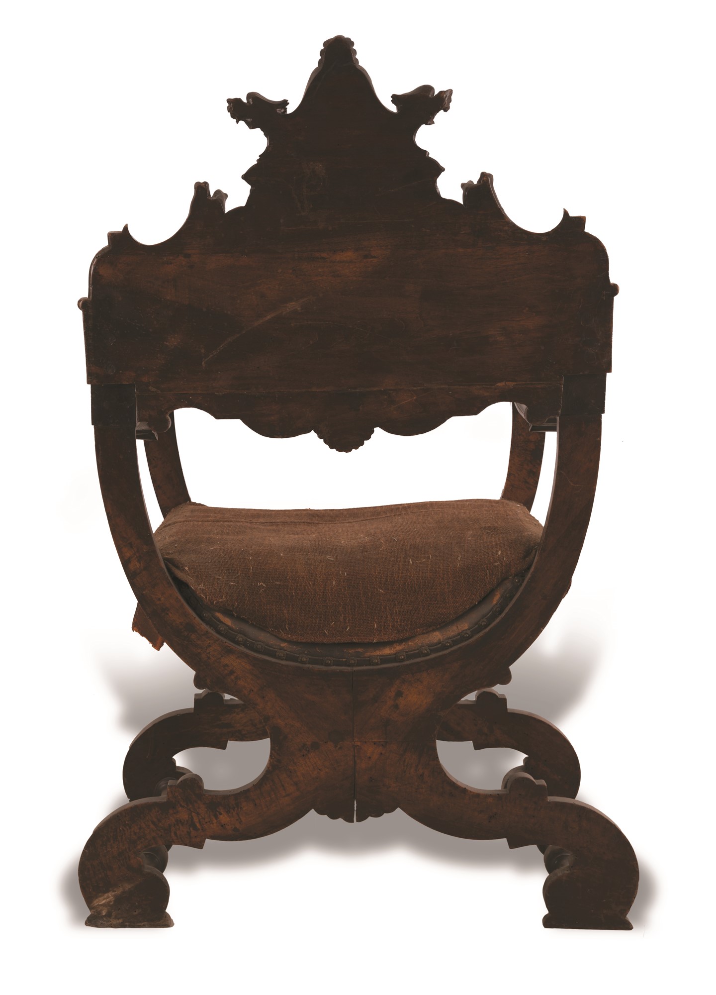 Braccioli intagliati con mascheroni.Spalliera con stemma nobiliare.