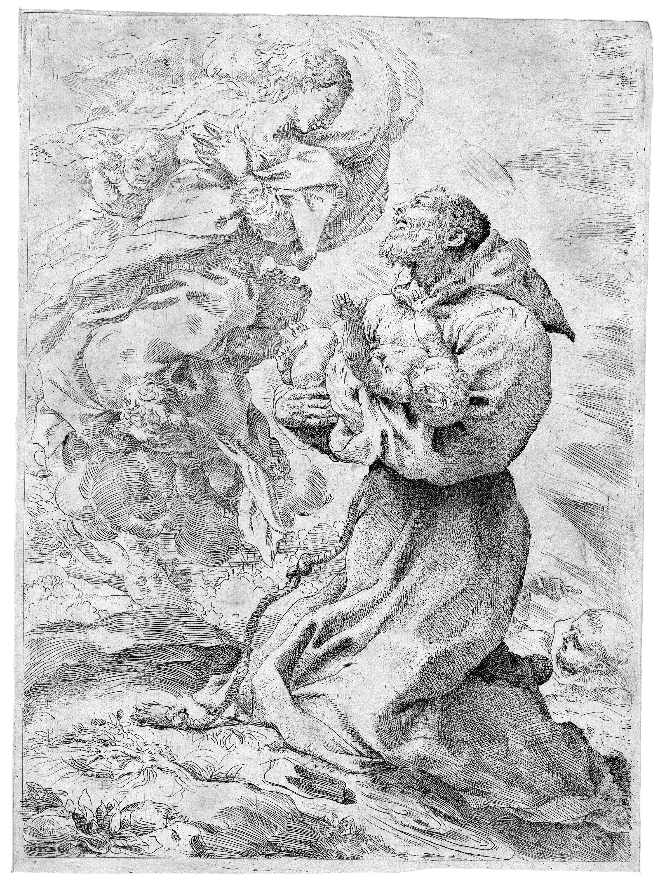 Da un disegno in controparte conservato al Louvre per il dipinto nella Chiesa dei Cappuccini di Bologna. Si tratta dell’unica incisione di attribuita a Faccini da una sua invenzione. Stato unico conosciuto.