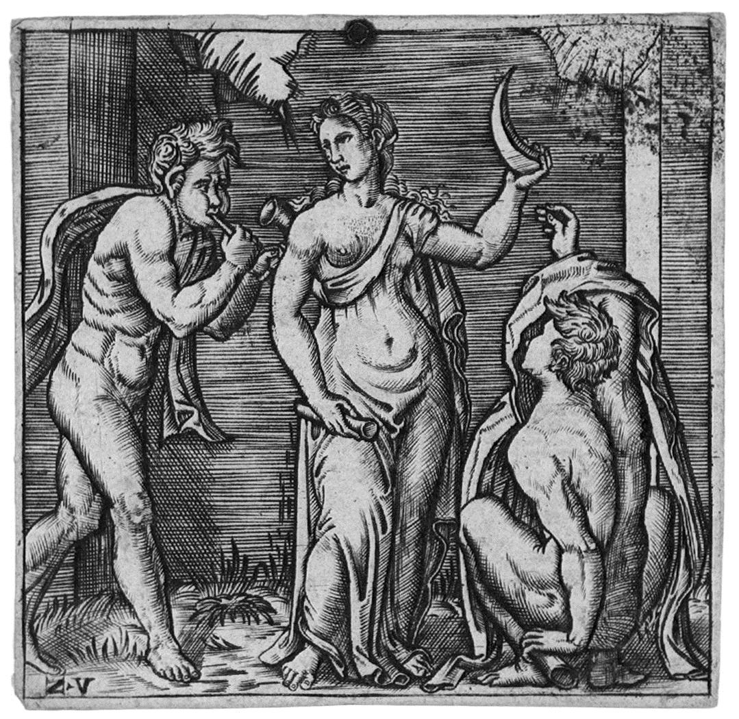 Replica in controparte di una incisione di Marcantonio Raimondi (TIB 27/14, 354) da un soggetto probabilmente di Francesco Francia. Incisore anonimo italiano della prima metà del XVI secolo; nel catalogo della collezione Malaspina il monogramma è ritenuto di Zoan Andrea.