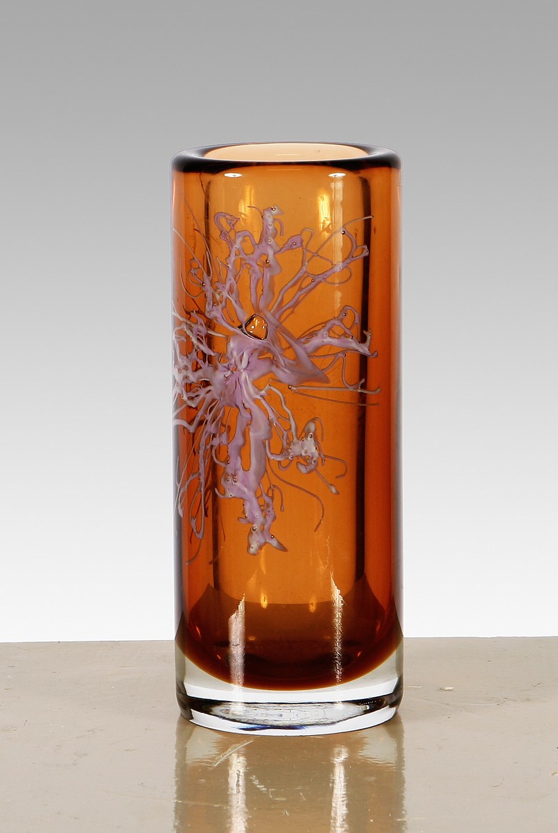 PRODUZIONE ITALIANA - ITALIAN WORK. Vaso cilindrico fumé,ornato con inclusioni filiformi bianche. Cylindrical smoky vase,decorated with white glass inclusions. Vetro. Cm 8,5x21,5. 1970.