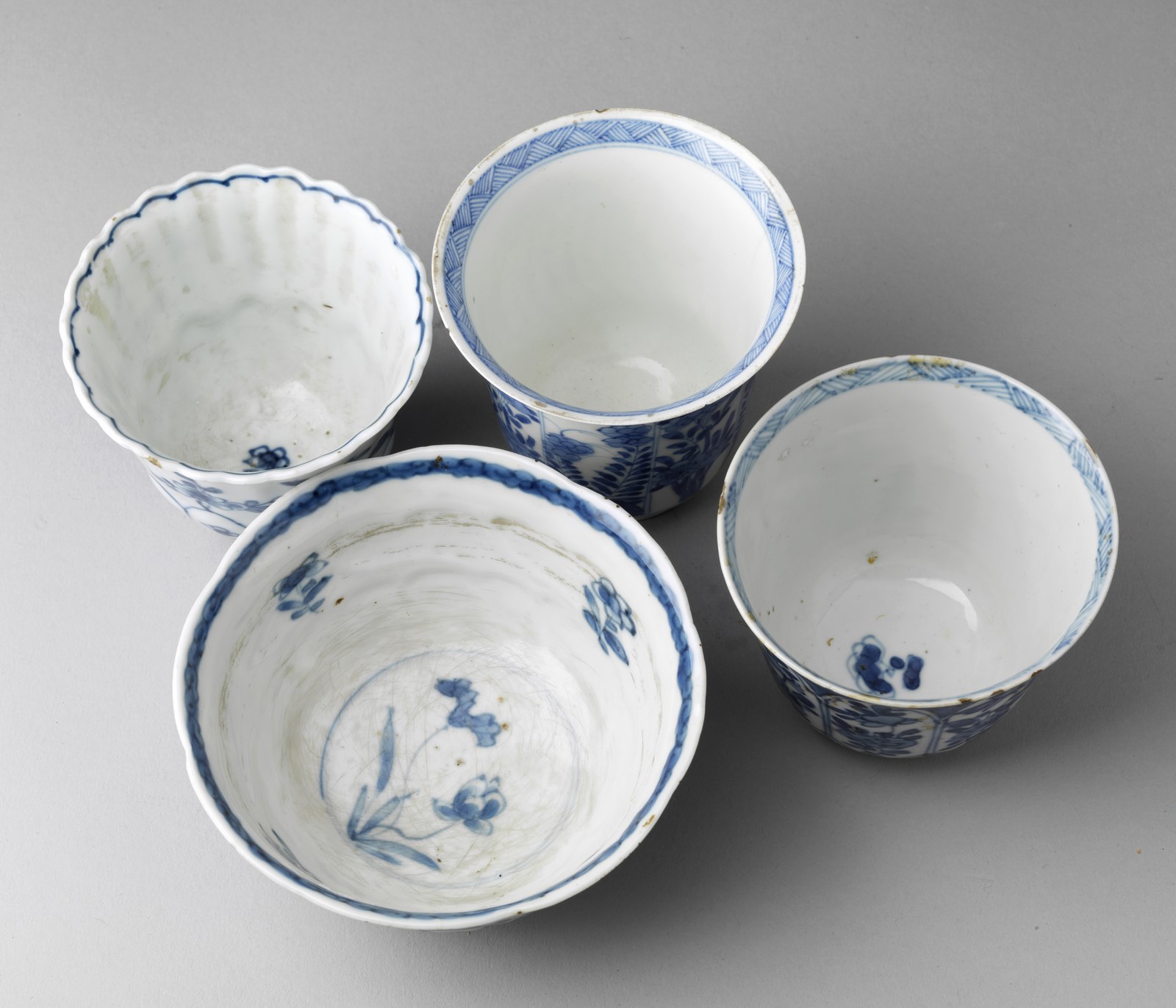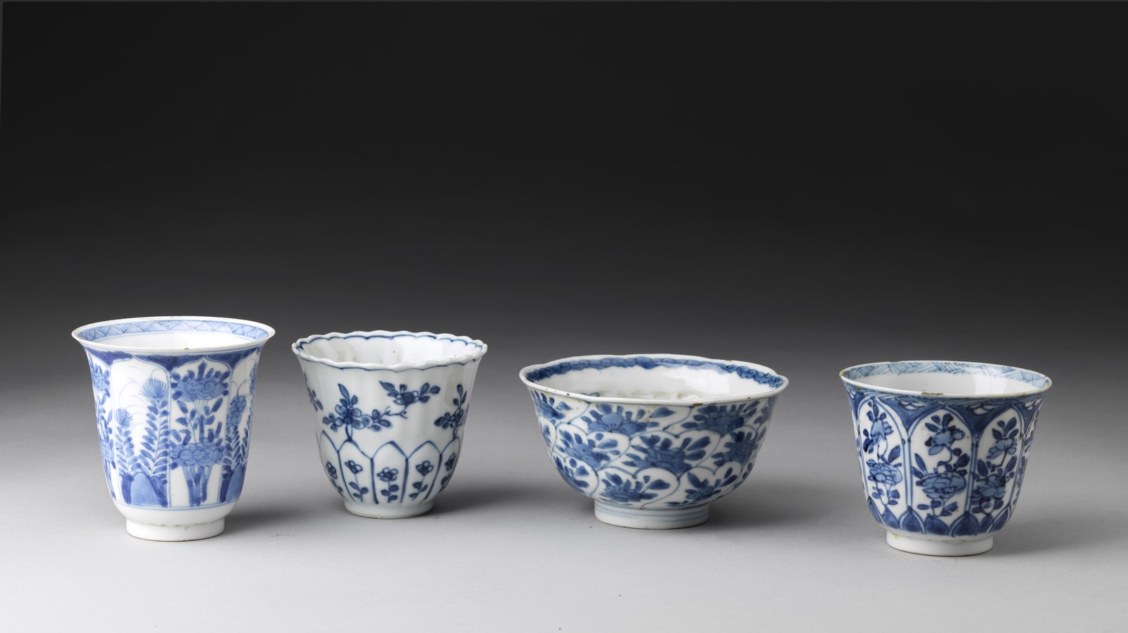 Cina, dinastia Qing, inizi XVII secolo. . Cm 11,30 x 6,00. Lotto composto da una ciotola lobata e tre tazze a bicchiere in porcellana bianco blu. Due pezzi presentano sul fondo marchio di manifattura.
