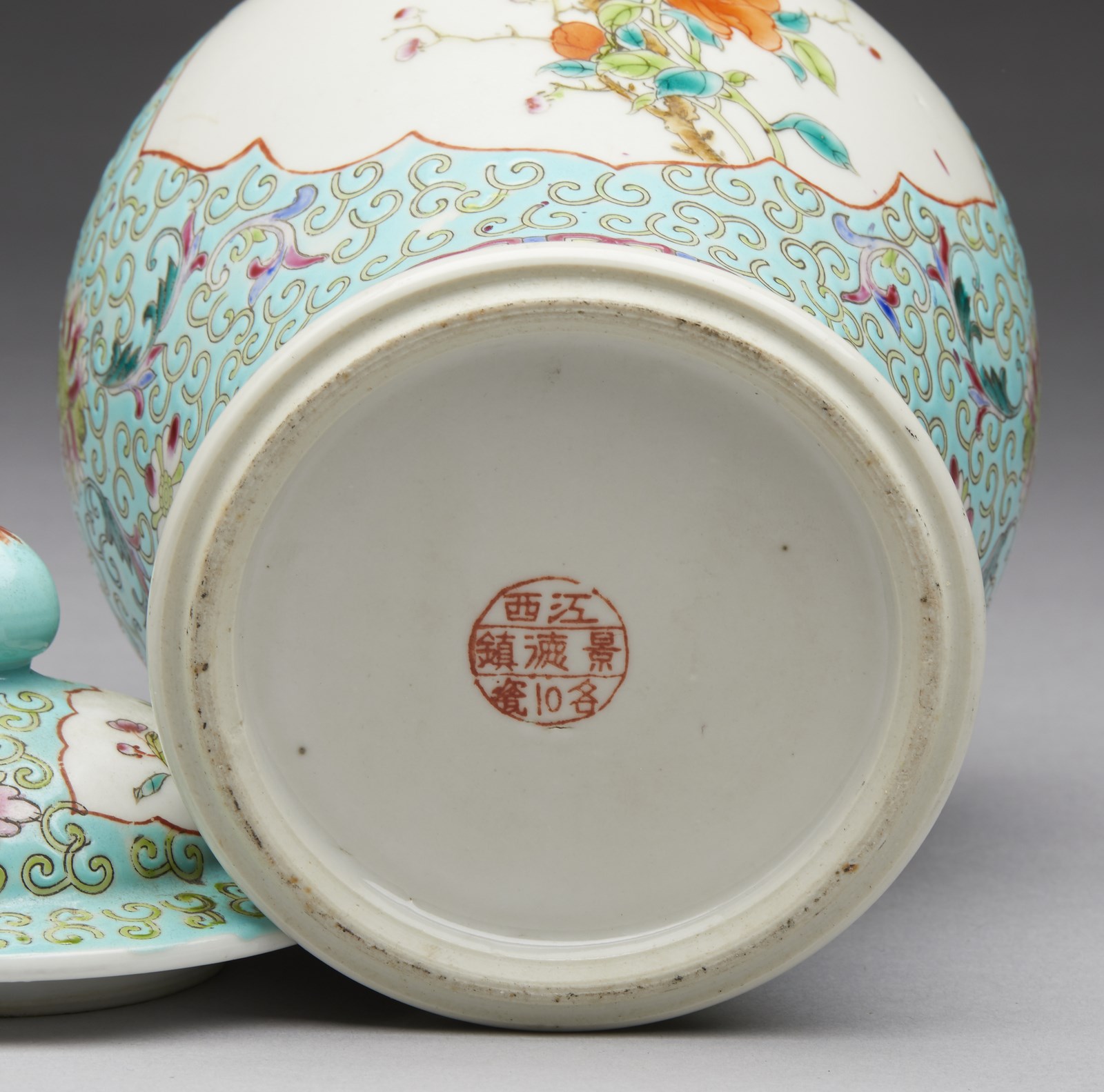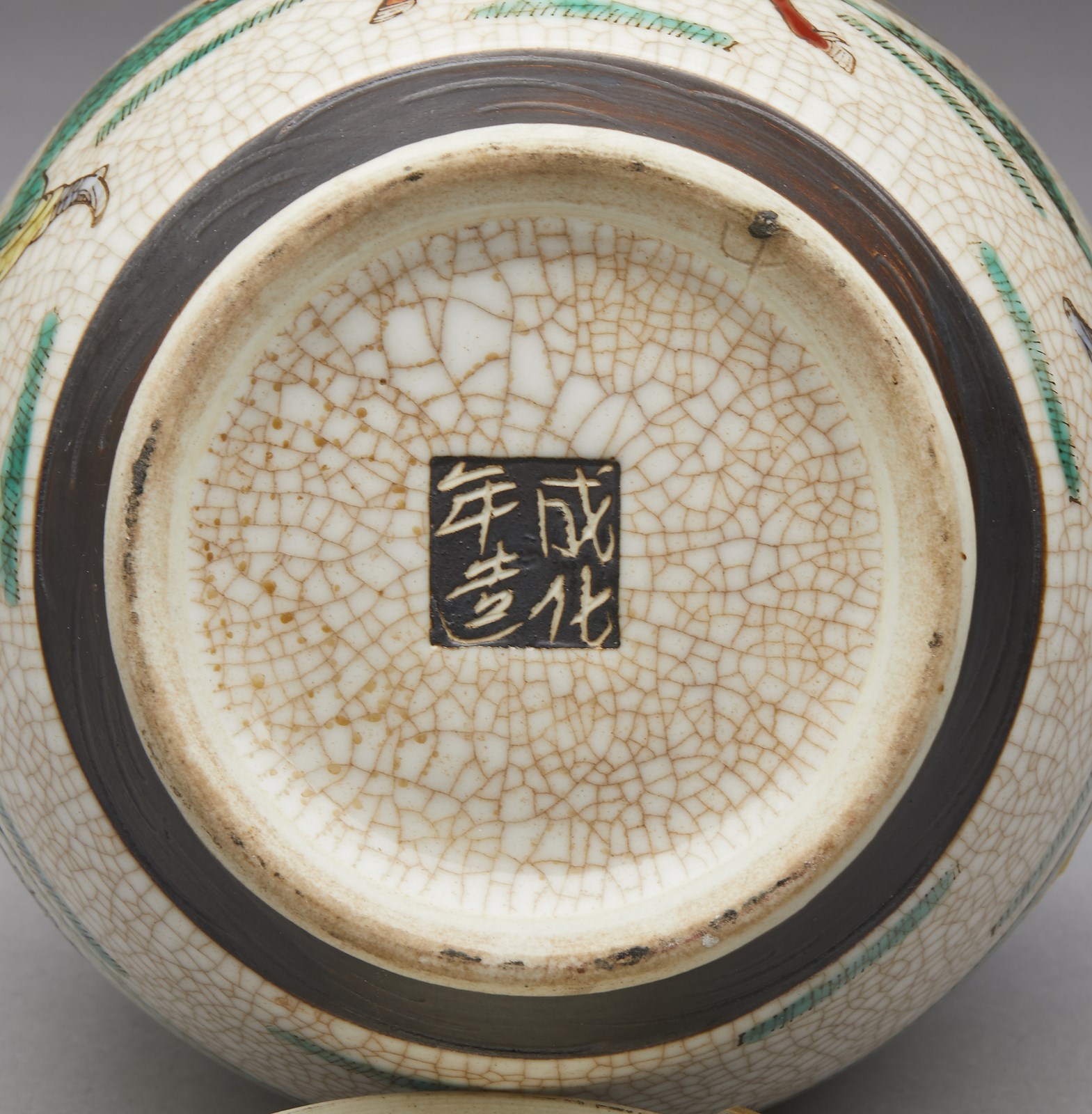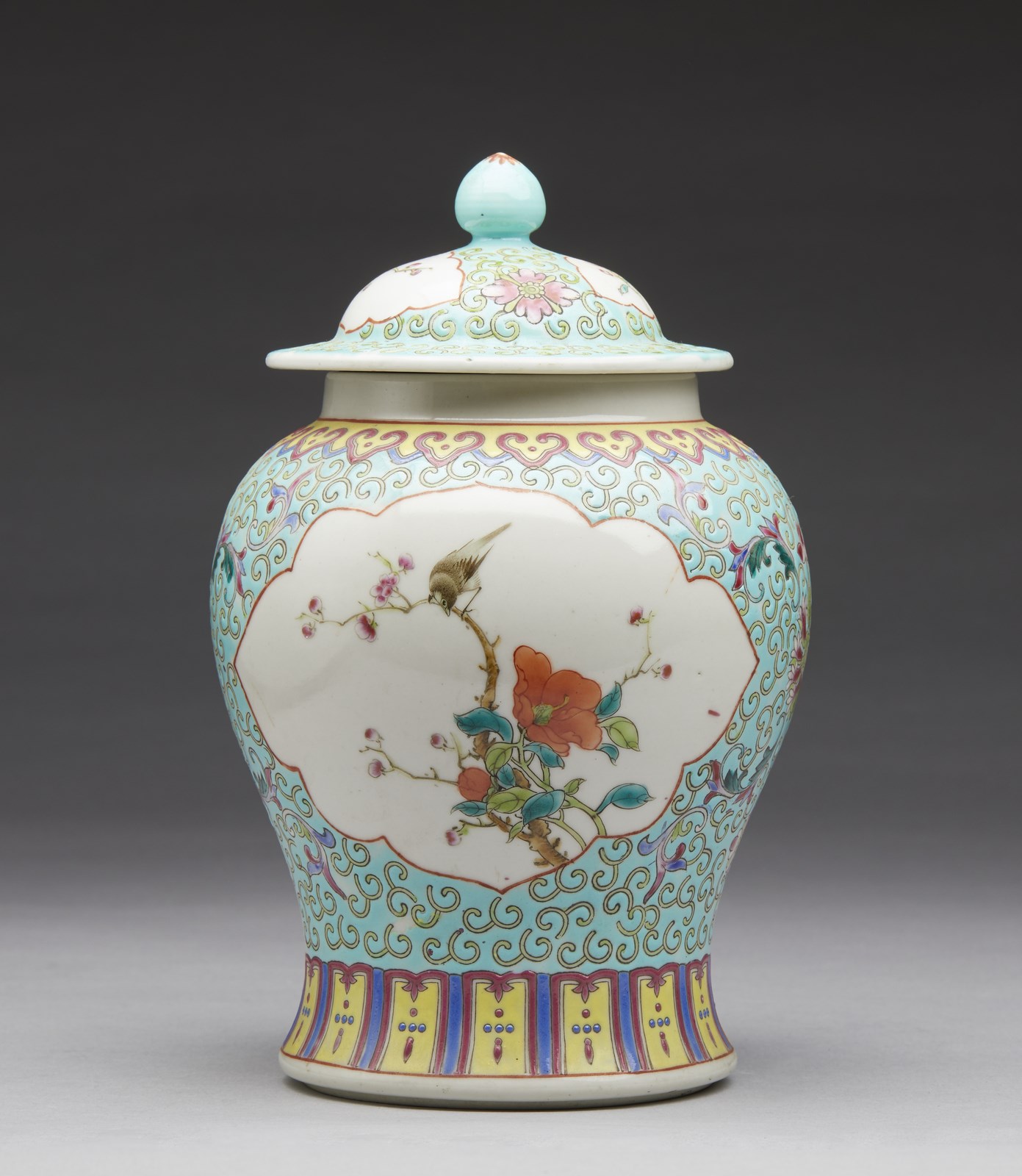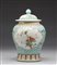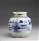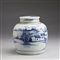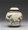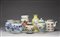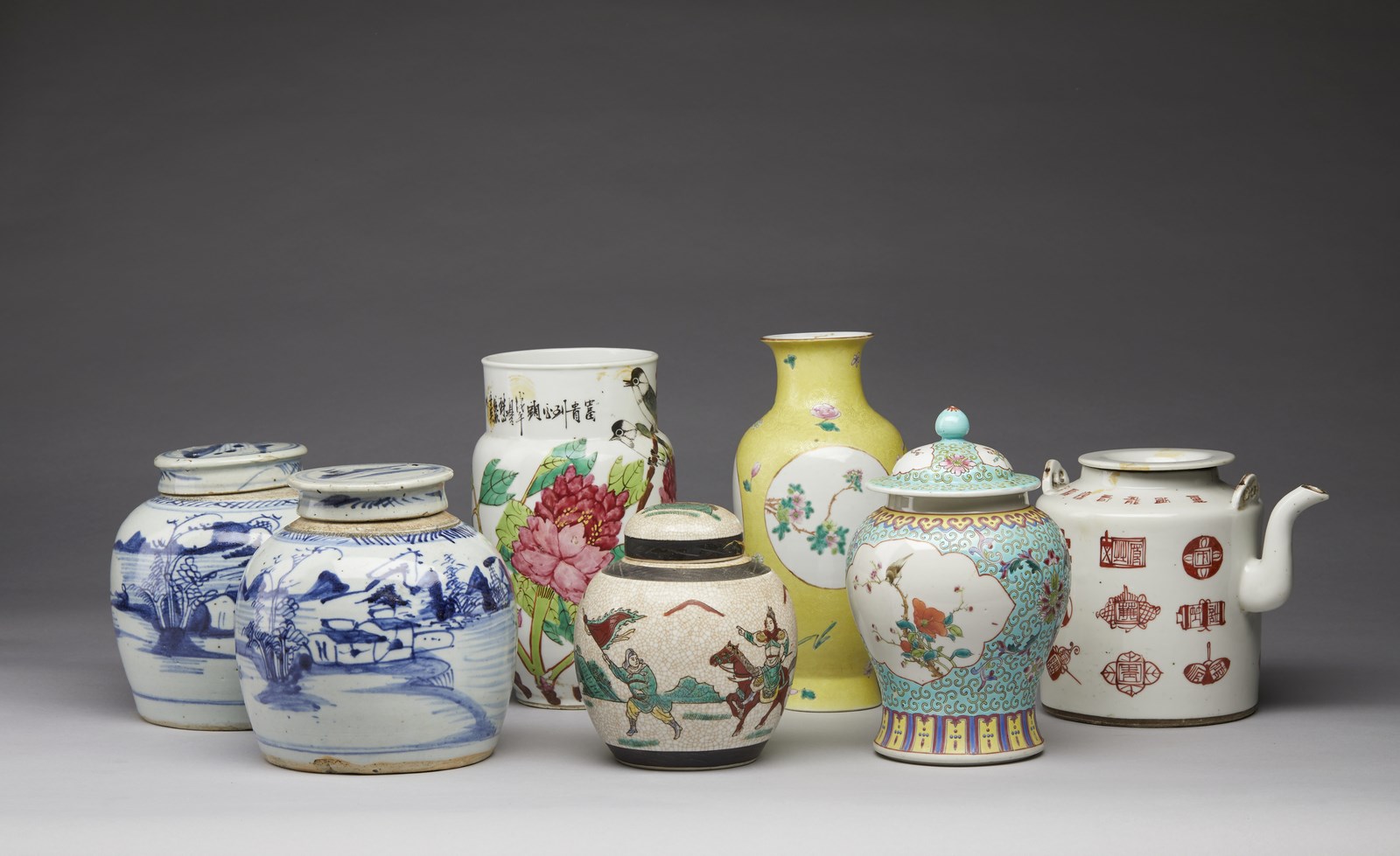 Cina, XIX-XX secolo . . Cm 13,00 x 22,50. Include: due potiche con coperchio dipinte in blu sottocoperta; un vaso a balaustro con sfondo giallo; una potiche con coperchio decorata con tralci vegetali su sfondo turchese, una grande teiera decorata con iscrizioni, una potiche con coperchio con invetriatura craquelè ed un vaso dipinto con peonie ed iscrizioni.
