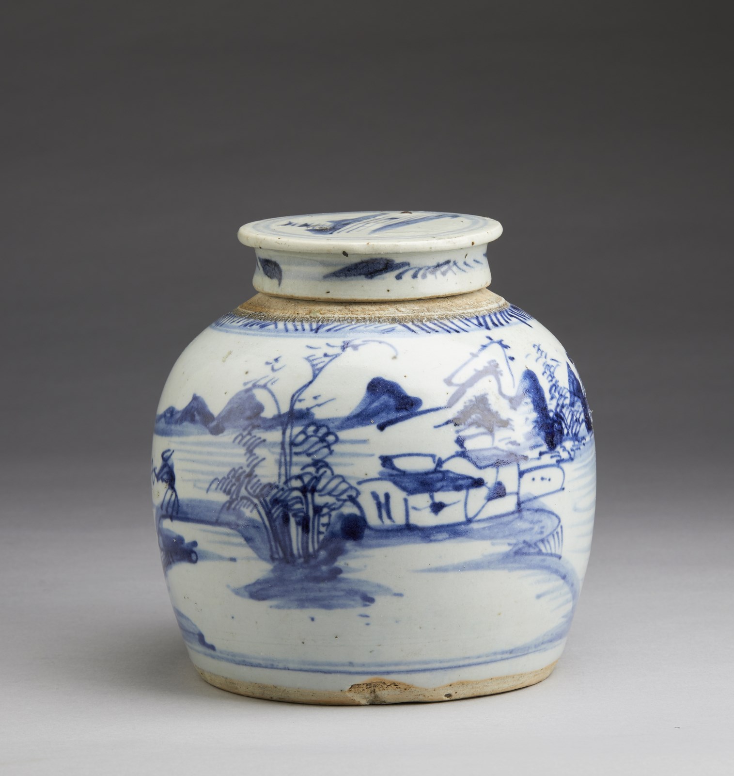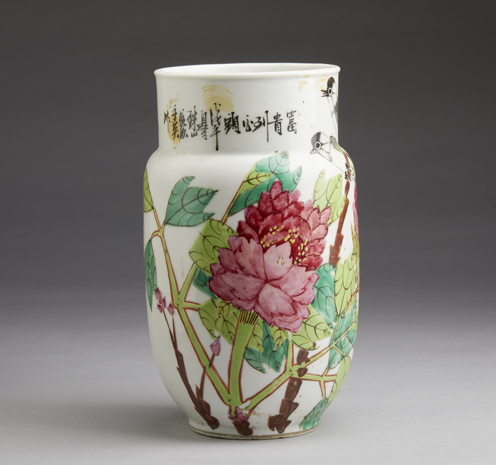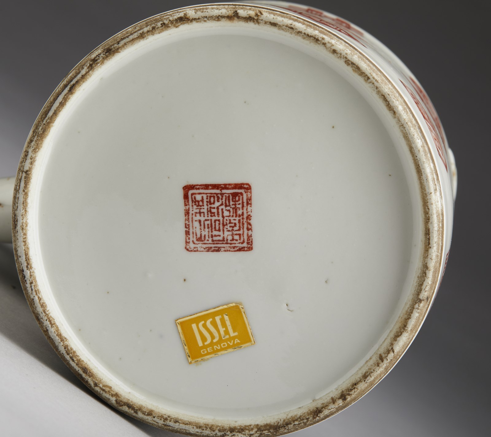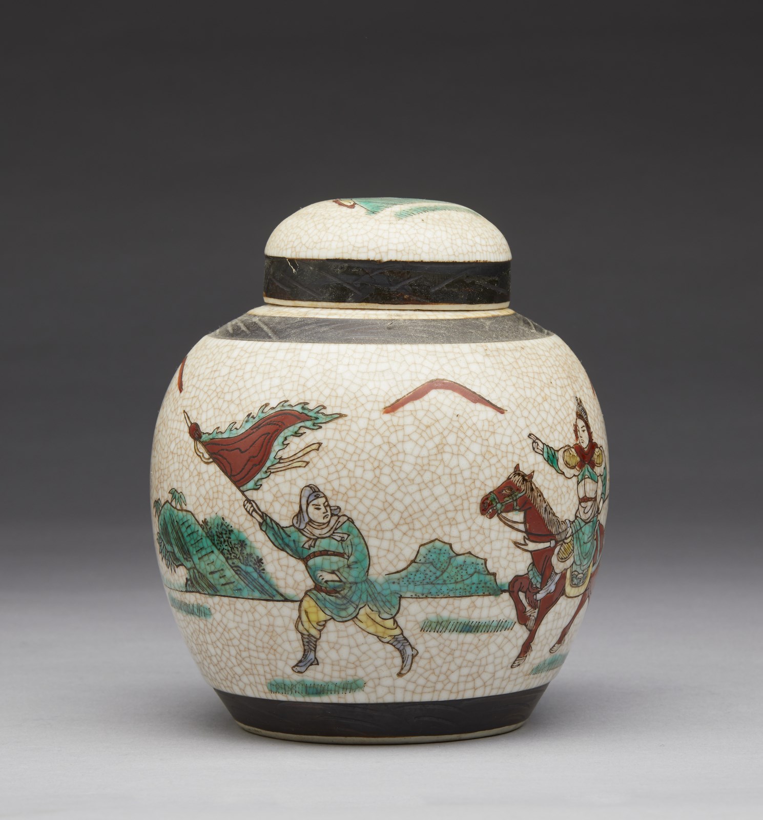 Cina, XIX-XX secolo . . Cm 13,00 x 22,50. Include: due potiche con coperchio dipinte in blu sottocoperta; un vaso a balaustro con sfondo giallo; una potiche con coperchio decorata con tralci vegetali su sfondo turchese, una grande teiera decorata con iscrizioni, una potiche con coperchio con invetriatura craquelè ed un vaso dipinto con peonie ed iscrizioni.