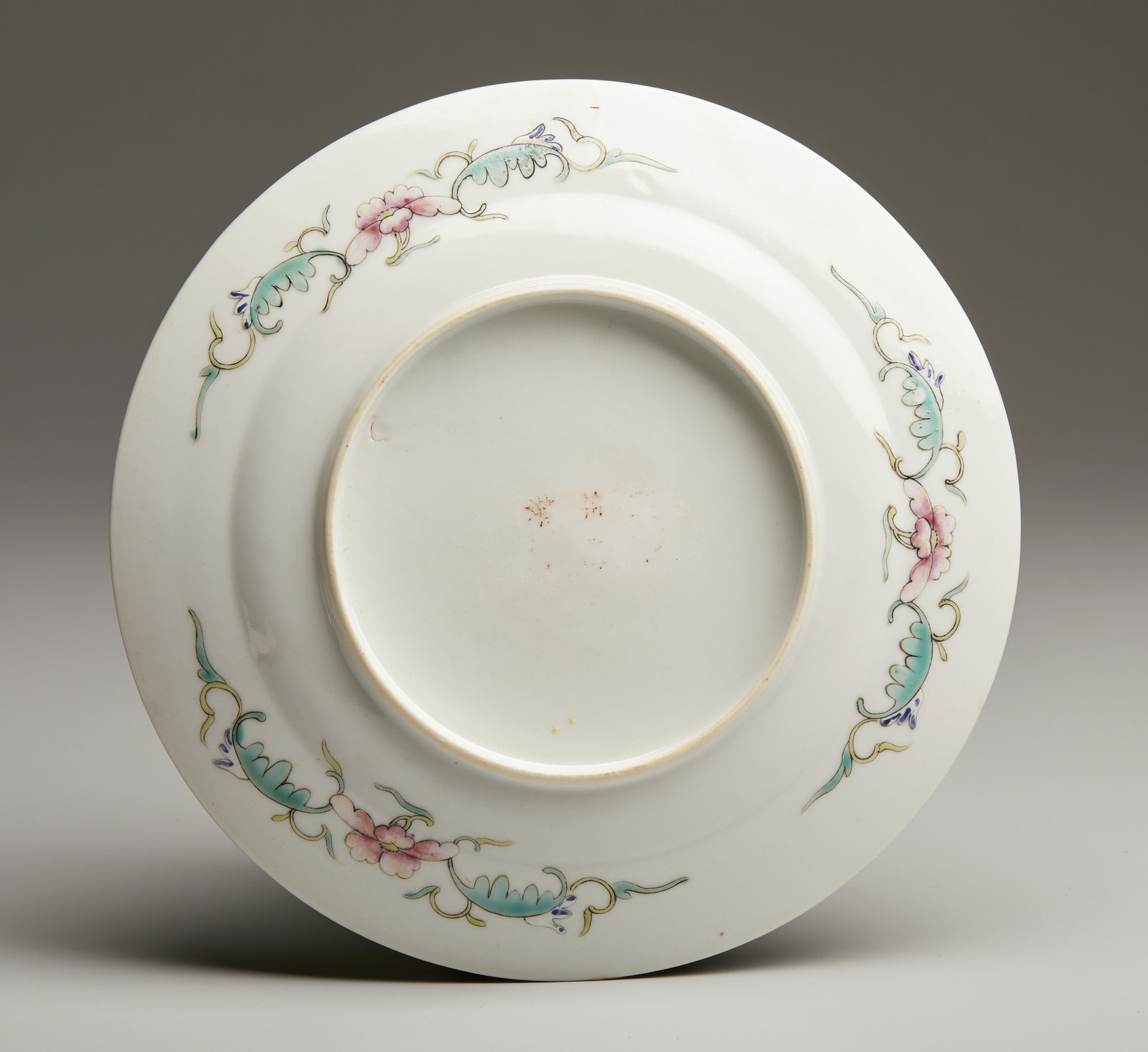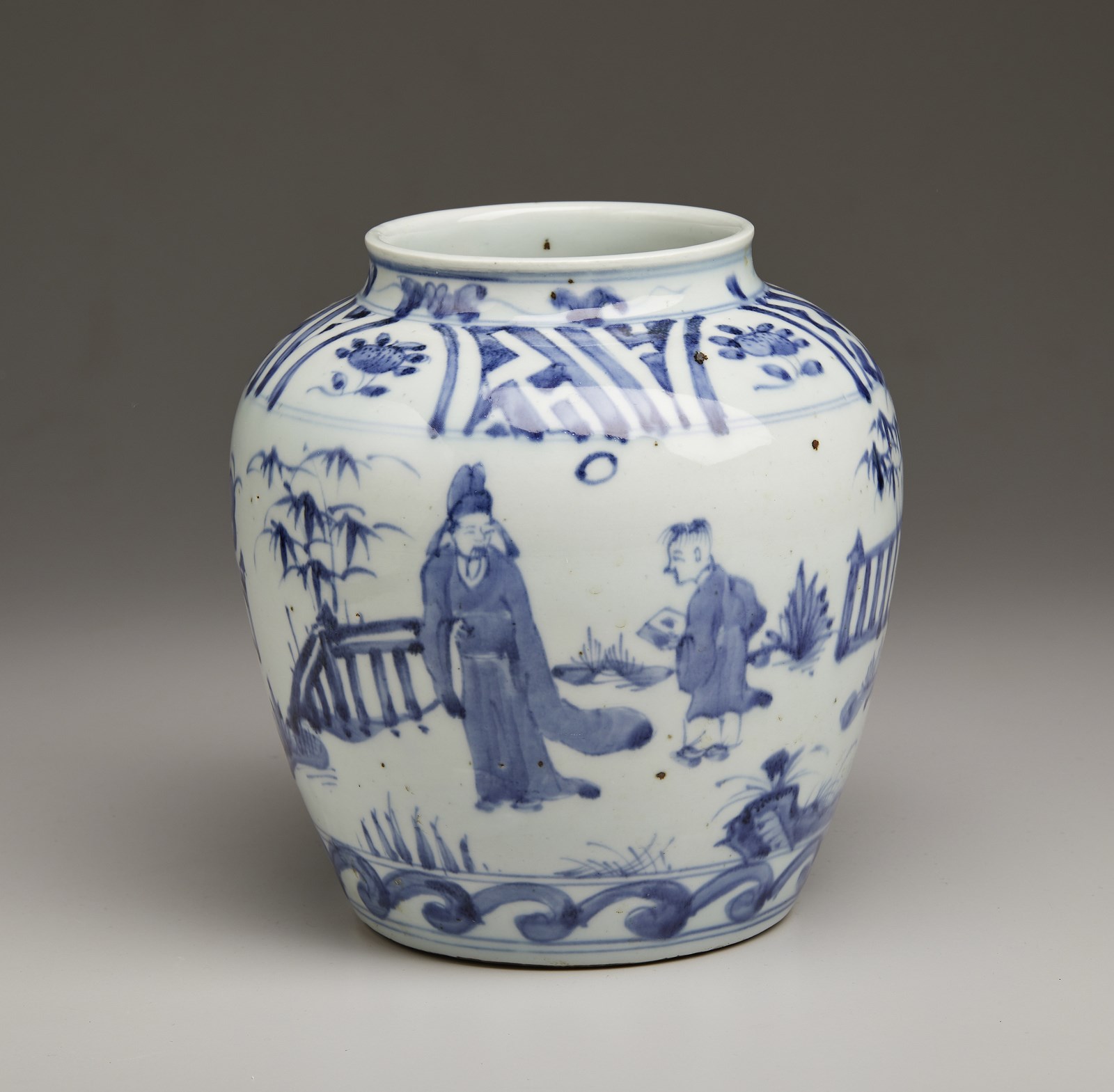 Cina, XX secolo . . Cm 17,50. Include: Una giara in ceramica bianco e blu con decorazione figurativa (h. 17,5 cm) ed un piatto in porcellana smaltata con ideogrammi e simboli di buon auspicio (diam. 21,3 cm).