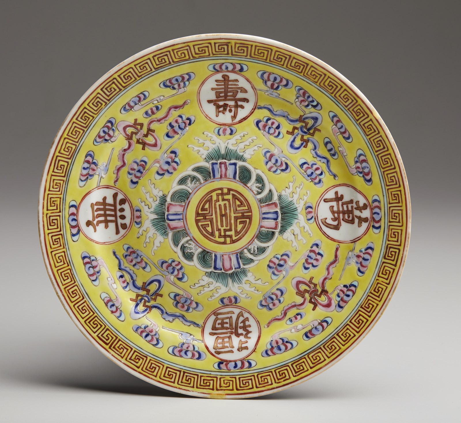 Arte Cinese - Lotto composto da giara e piattino a fondo giallo Cina, XX secolo .