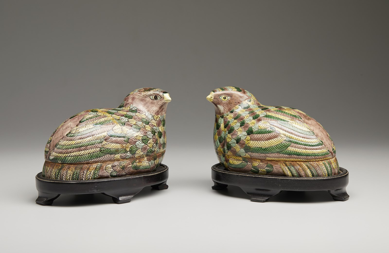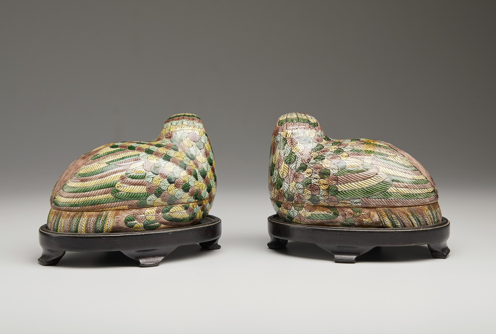 coppia di scatole a forma di quaglie policrome (h. 10 X 15,5 cm) con base in legno