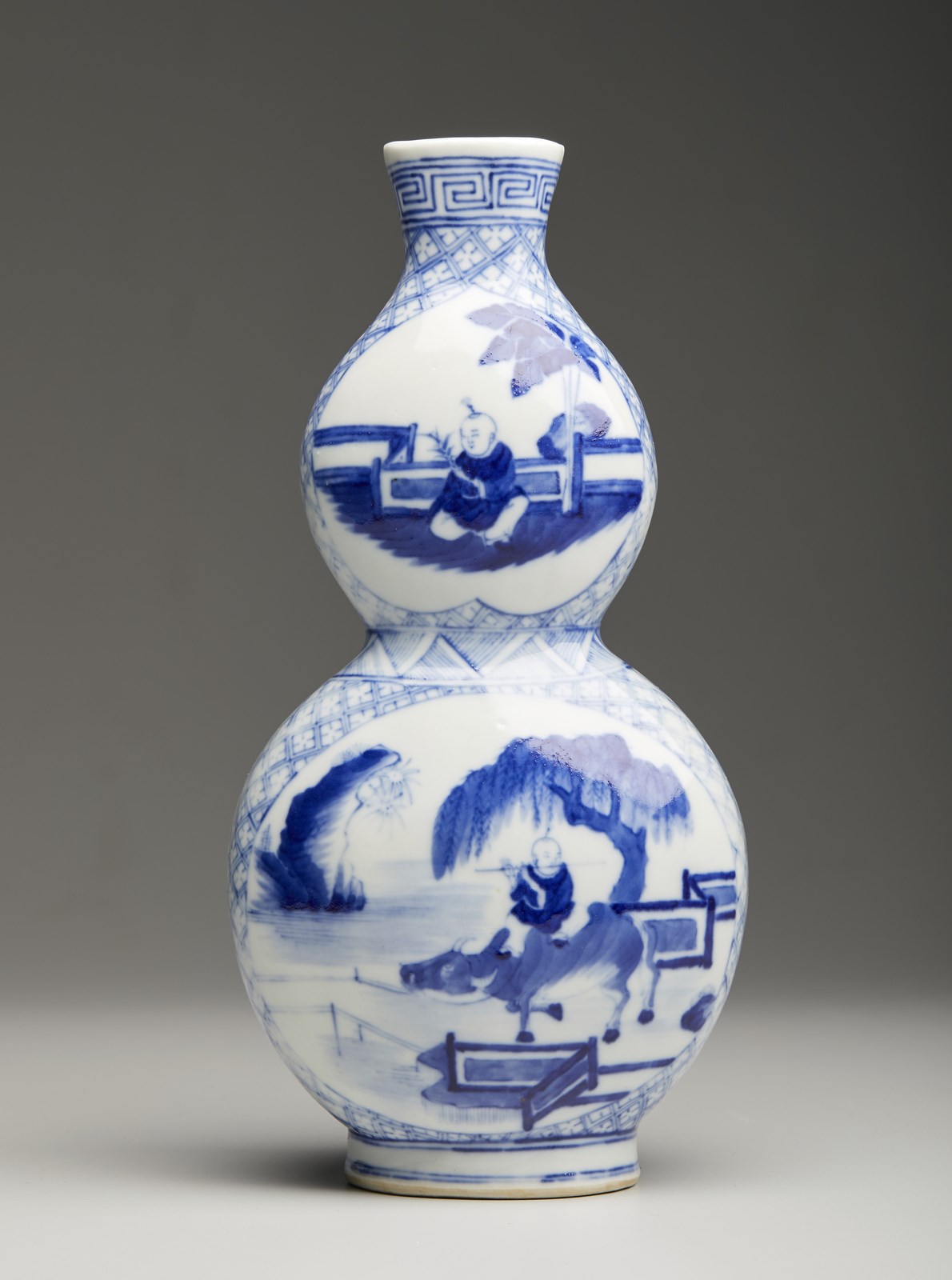 vaso bianco e blu a forma di doppia zucca con marchio a quattro caratteri sulla base (h. 27 X l. 13);
