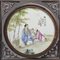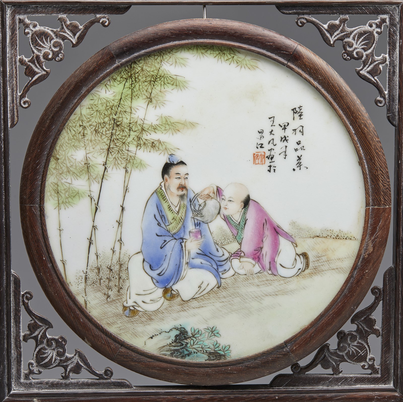 Cina, XX secolo . . Cm 29,00 x 35,00 x 12,00. Elemento decorativo con montatura in legno intagliato a traforo con motivi vegetali intrecciati che ospita una placca in porcellana (diam 20 cm ca.) dipinta nei colori della famiglia rosa con letterato ed attendente in esterno. Iscrizione e sigillo in alto a destra.
