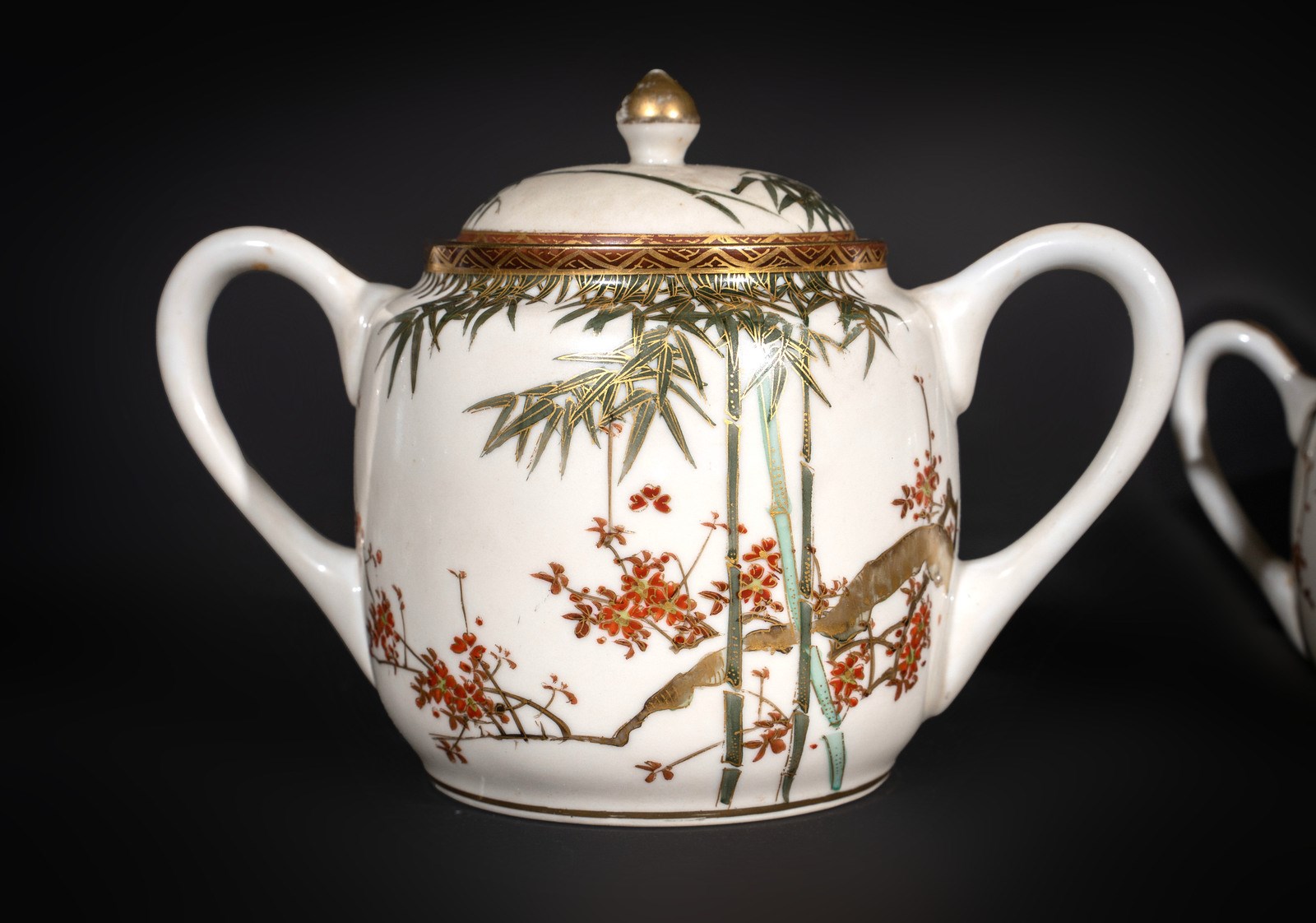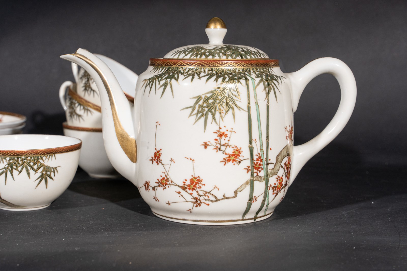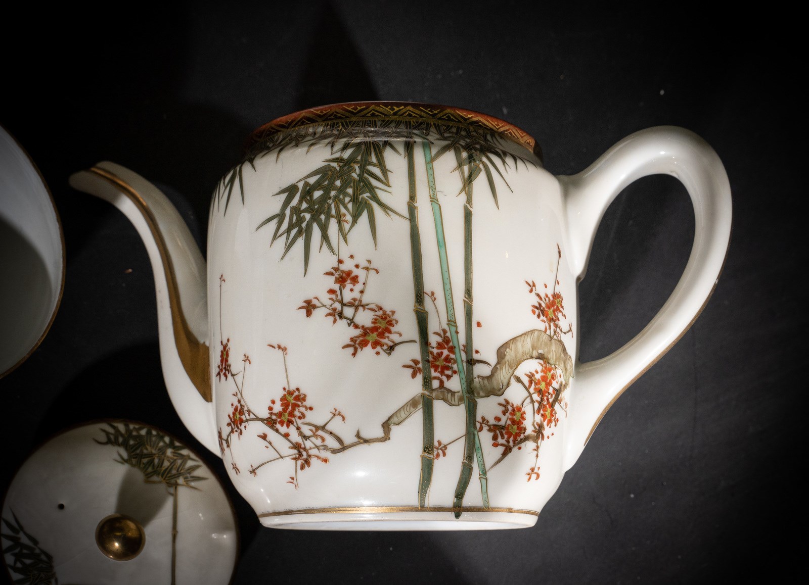 Giappone, XIX secolo . . . Lotto composto da otto tazze con piattino, una zuccheriera, una teiera ed un bricco per limone in porcellana bianca (forse Arita) con decoro a foglie di bambù e fiori con lumeggiature in oro.