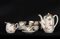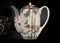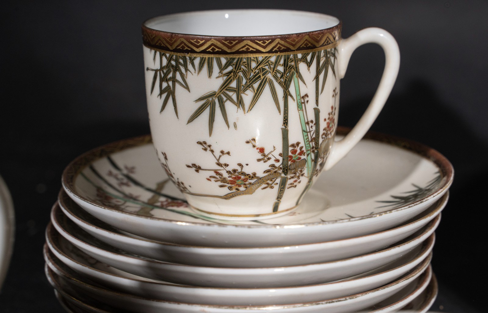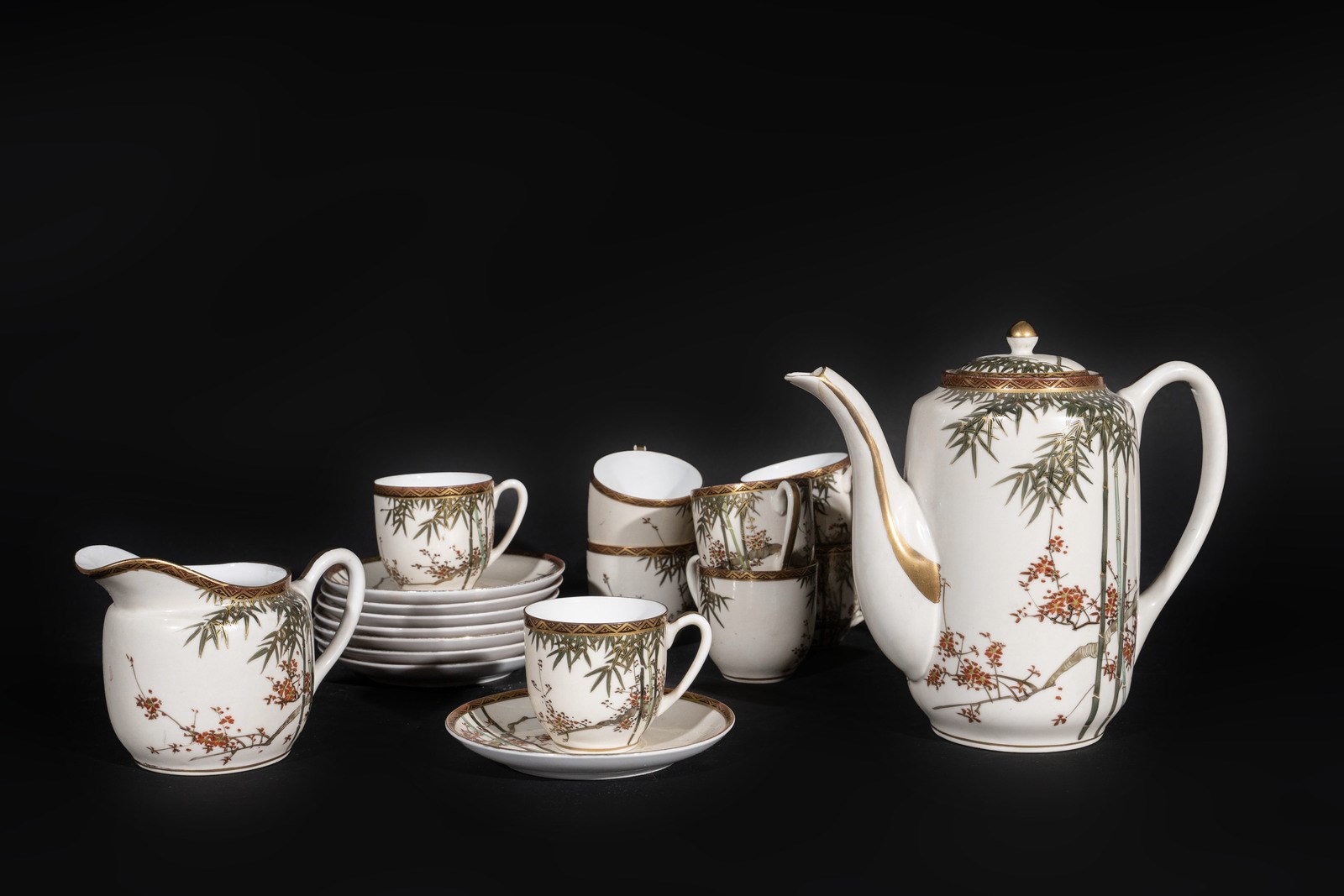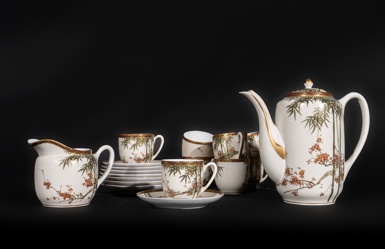 Giappone, XIX secolo . . . Include: otto piattini; otto tazzine, un bricco per il latte ed una caffettiera in porcellana bianca (forse Arita) con decoro a foglie di bambù e fiori con lumeggiature in oro.