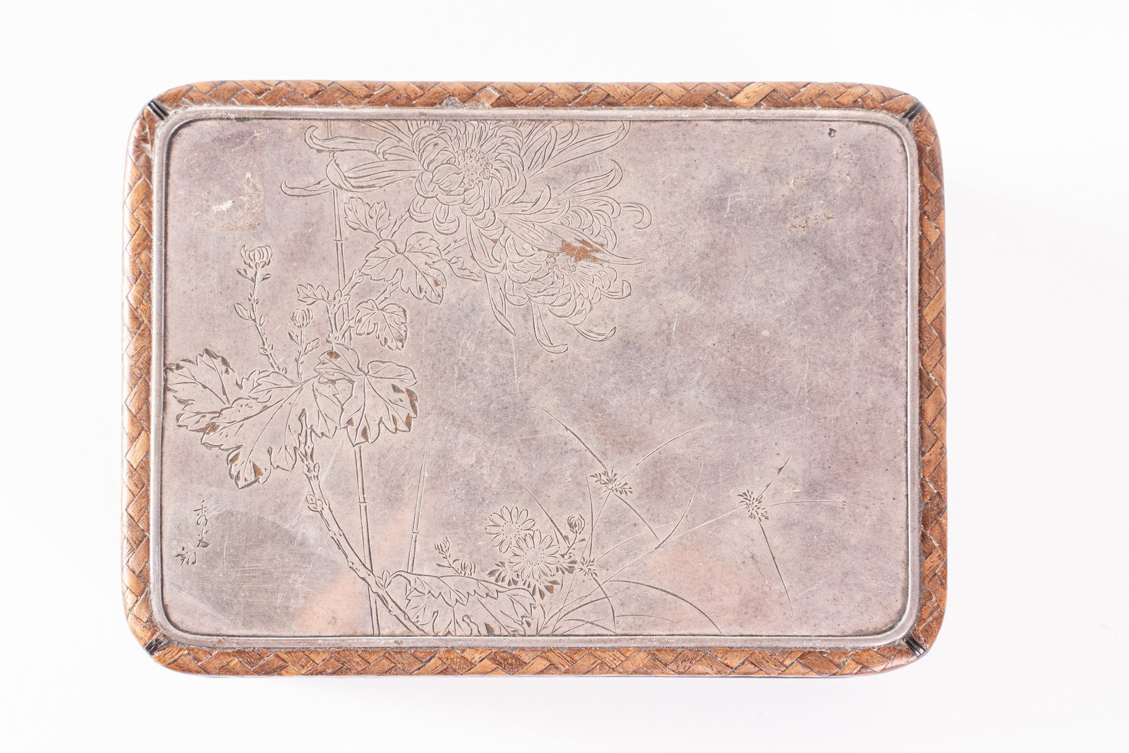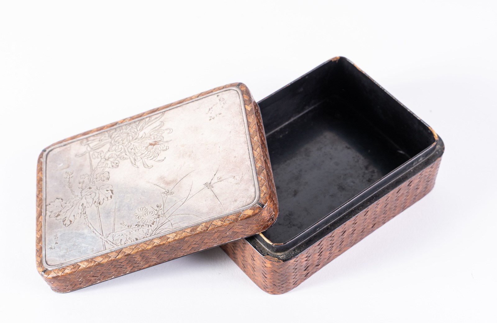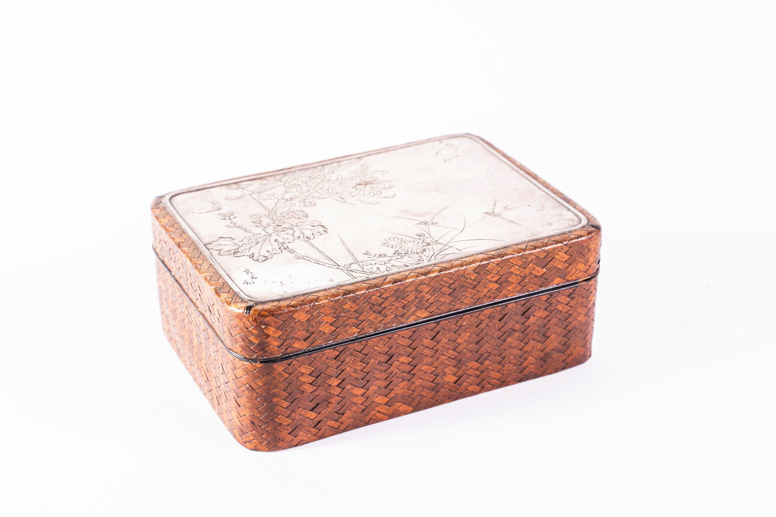 Giappone, XIX secolo . . Cm 14,50 x 6,00 x 10,50. A sezione rettangolare, le pareti intrecciate in vimini, il coperchio sormontato da placca in metallo argentato inciso con piante e fiori. Firma in basso a sinistra.