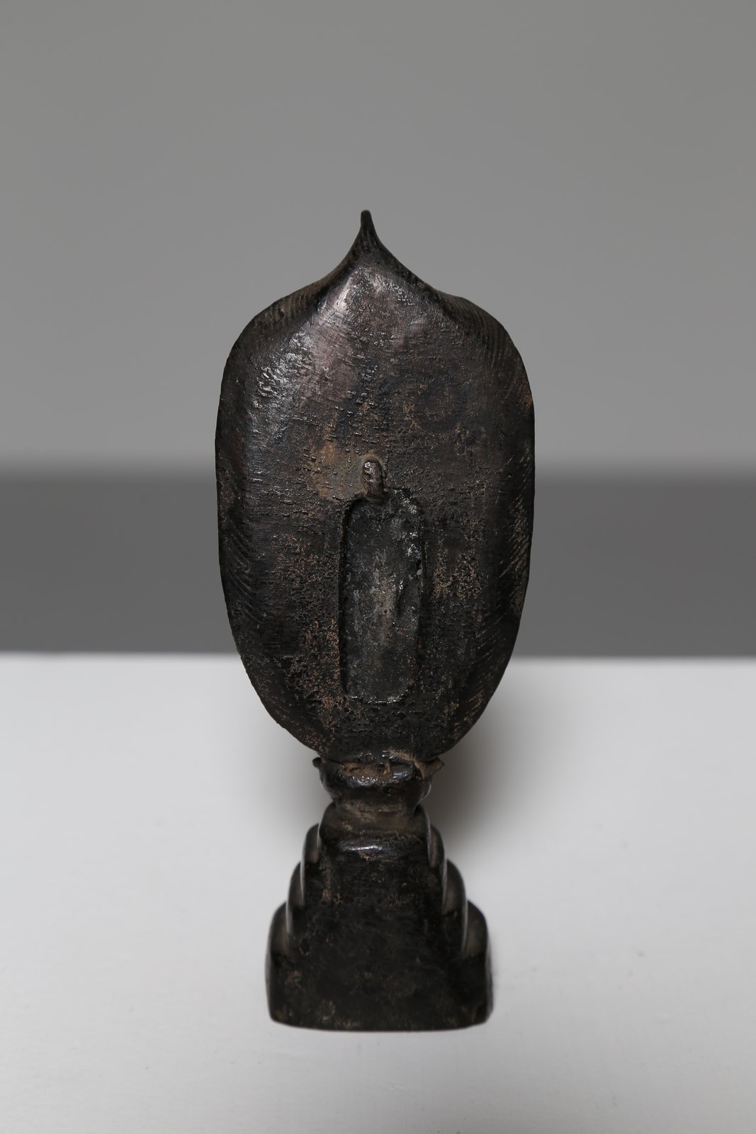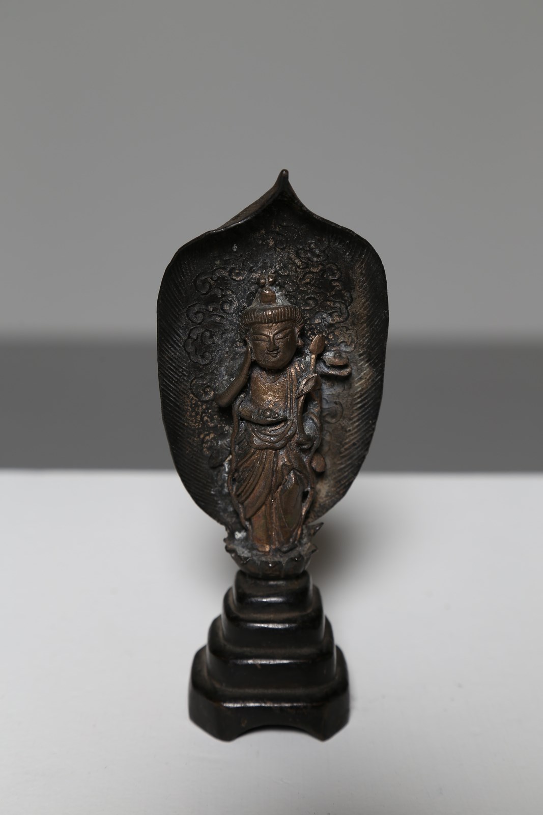 Cina, dinastia Yuan, XIII - XIV secolo. . Cm 14,50. Stante su base a loto singolo a sua volta appoggiata ad un supporto a più strati che sostiene la mandorla fiammeggiante dietro la figura.