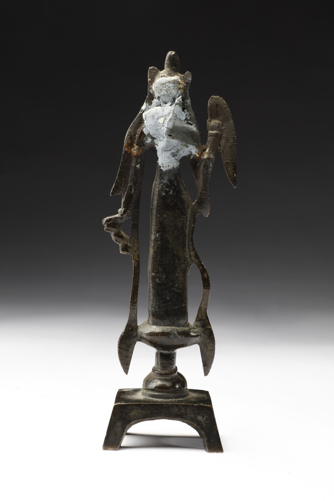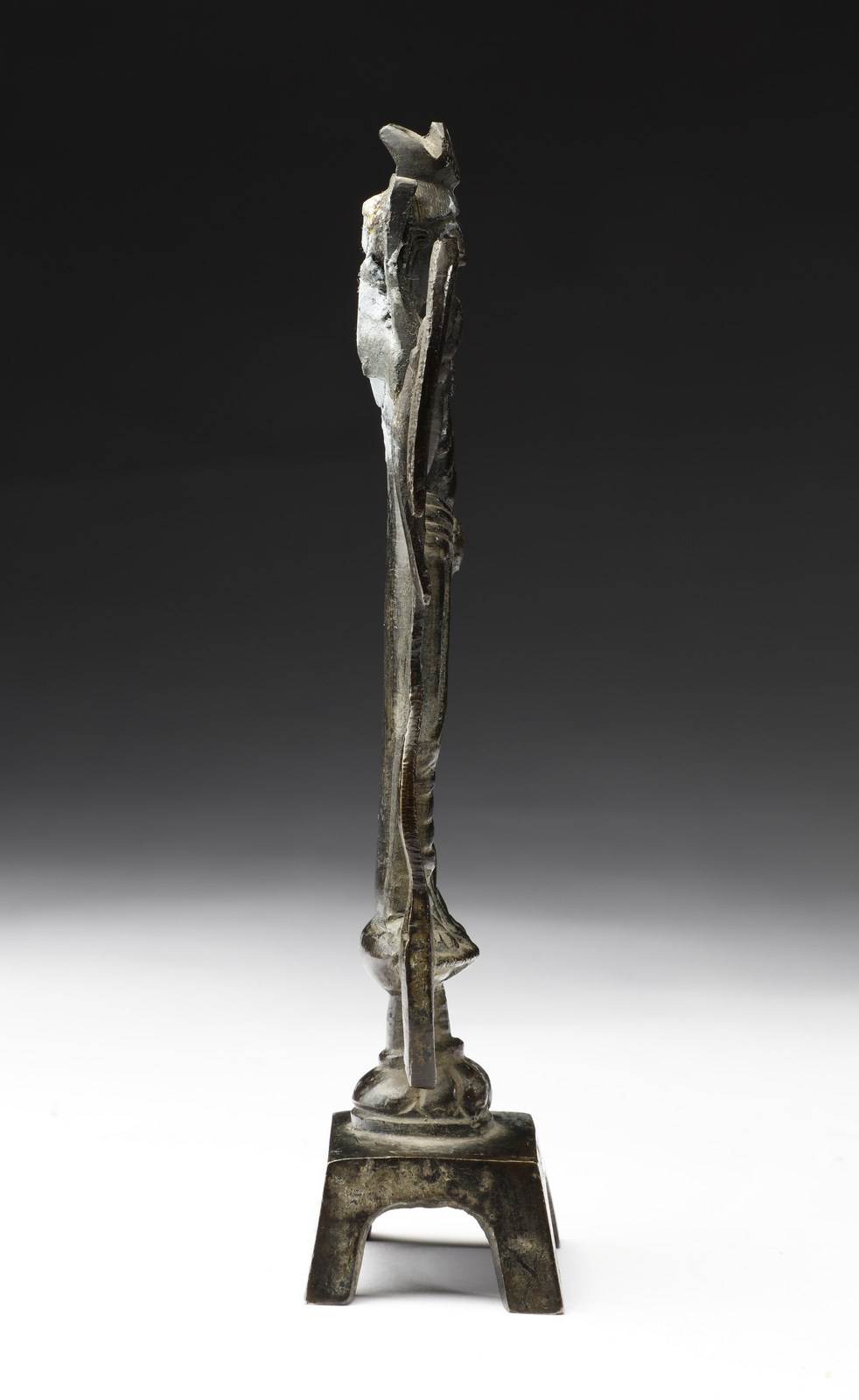 Cina, dinastia Qing, XIX secolo . . Cm 17,00. Fusione in bronzo a patina scura raffigurante figura slanciata di Guanyin.