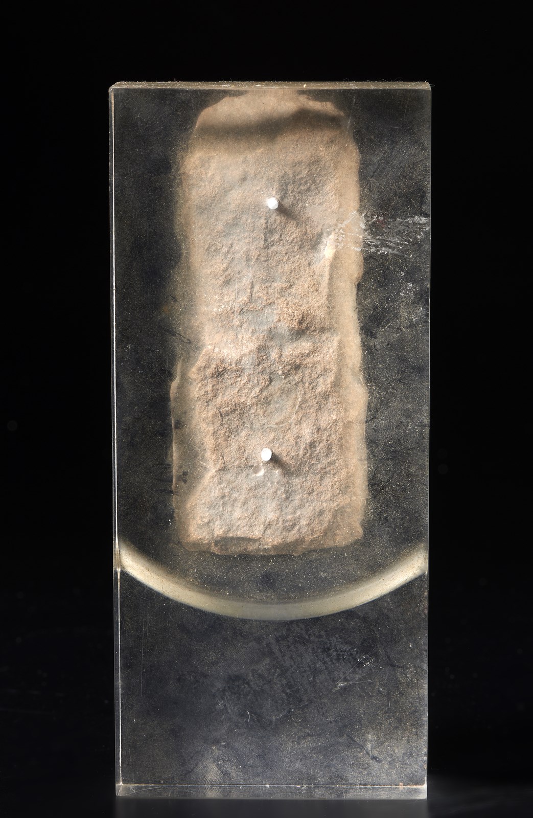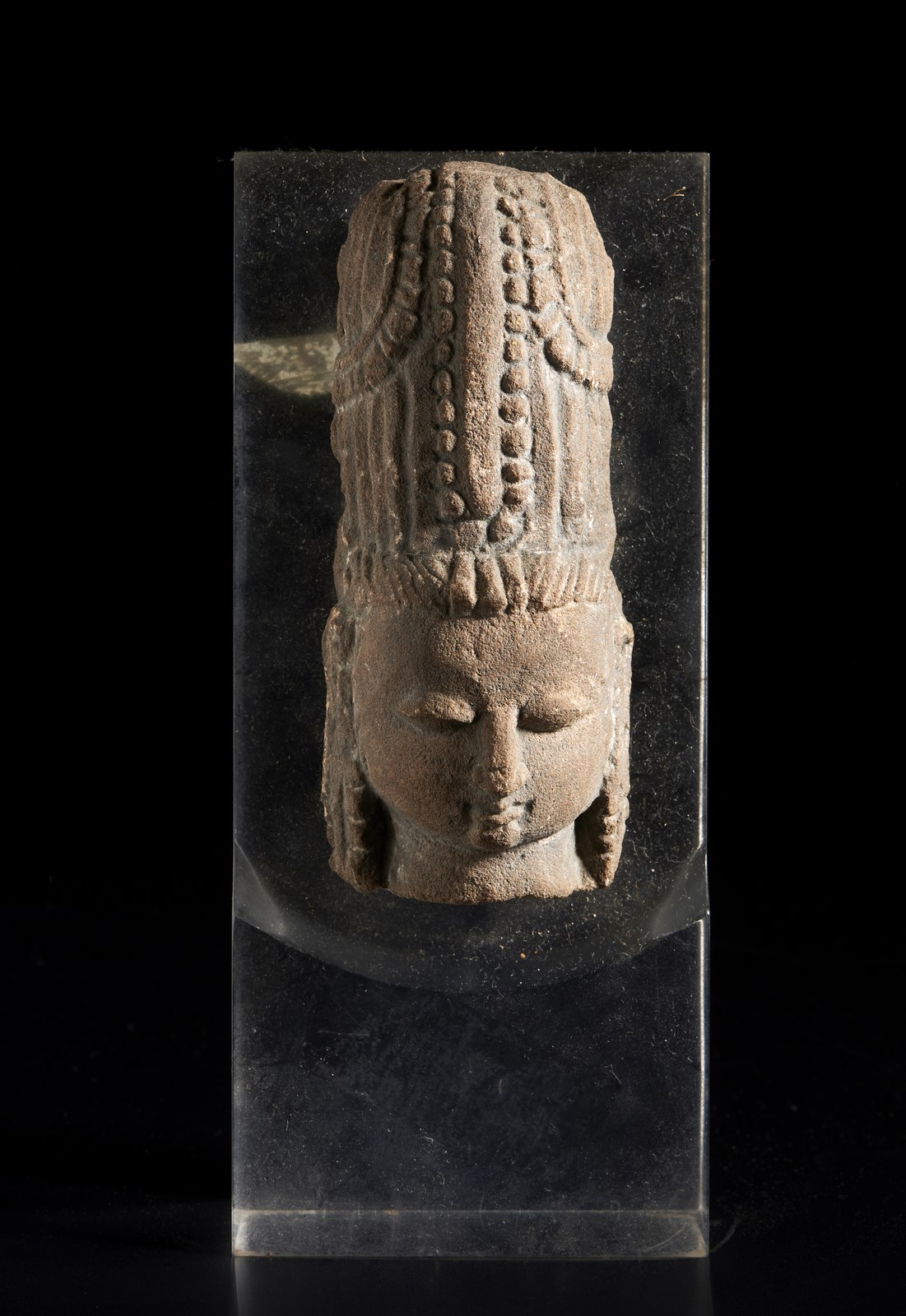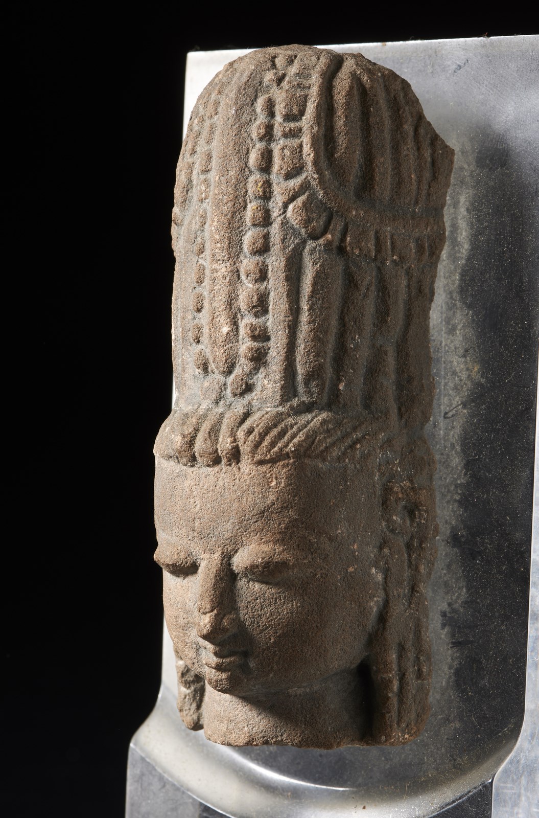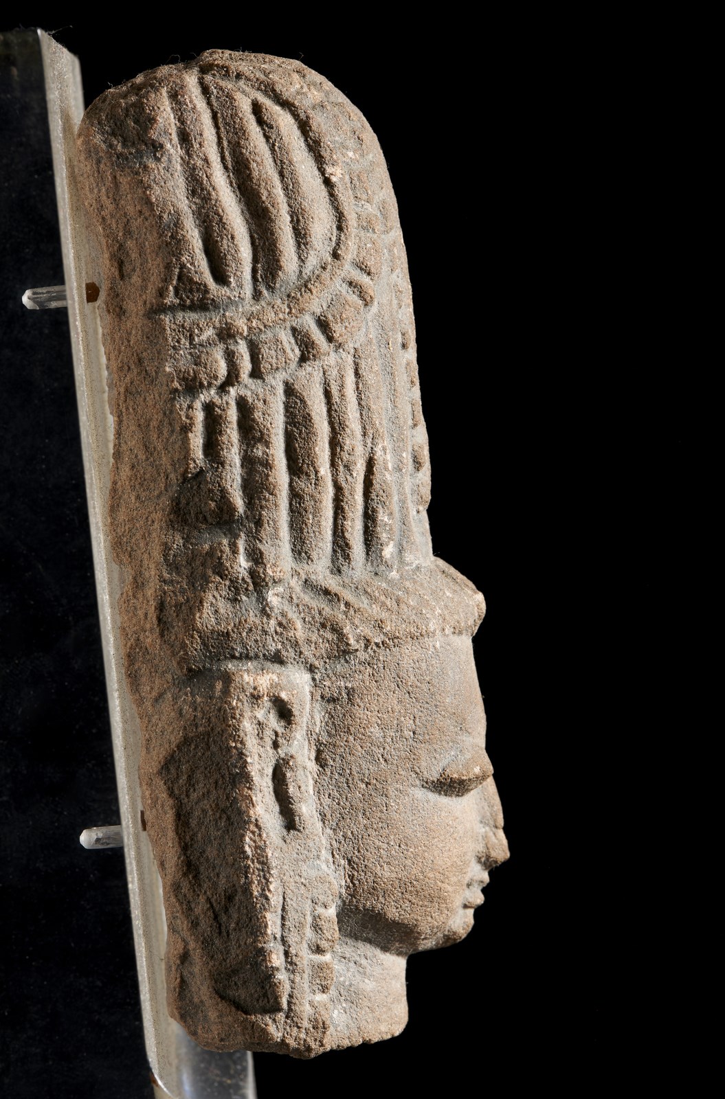 India, periodo Vijiayanagara, XVI secolo. . Cm 6,00 x 13,50 x 4,50. Frammento in pietra arenaria raffigurante testa con alta capigliatura.