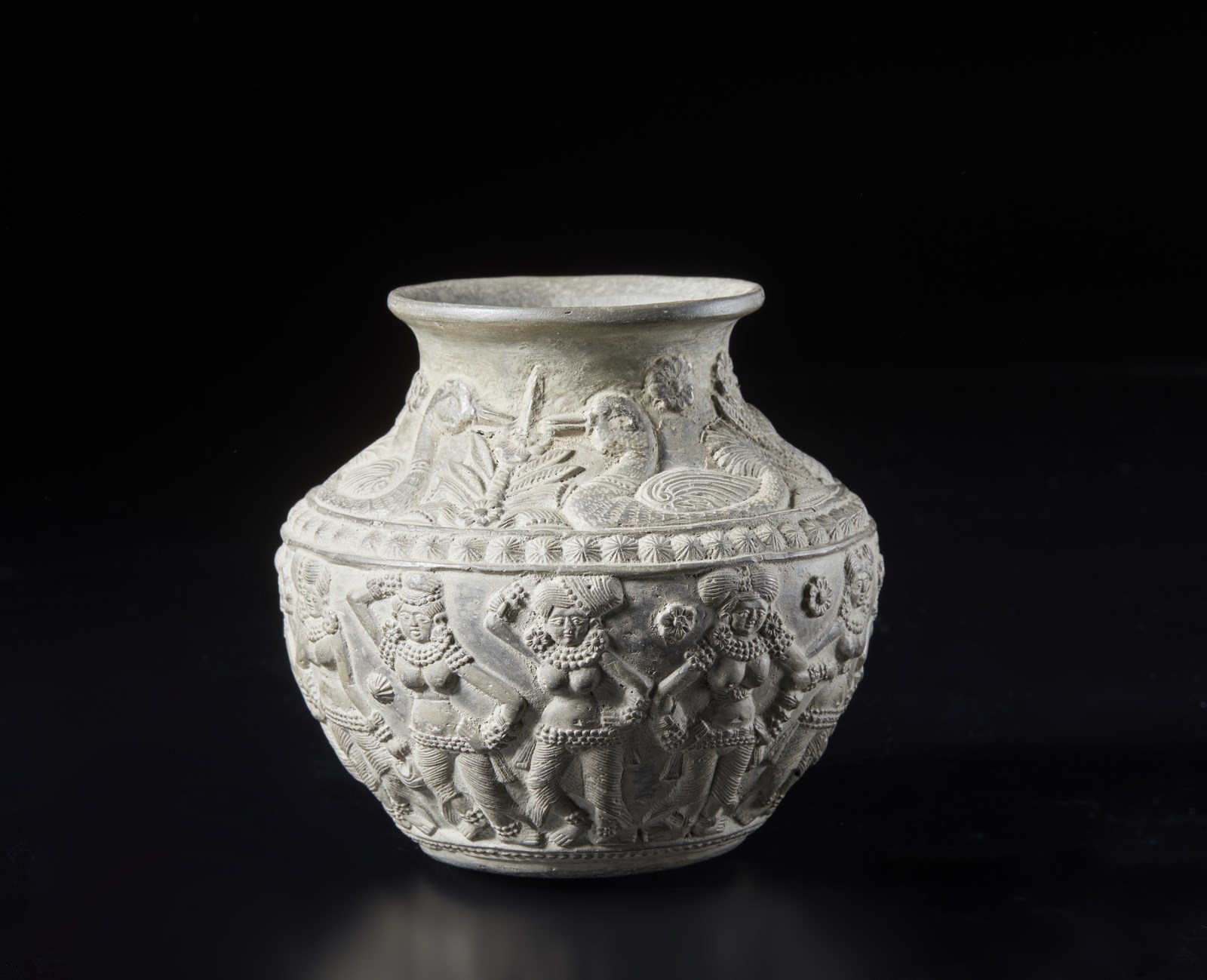 India, Bengala Occidentale, periodo Shunga, I secolo a.C.- I secolo d.C. . . Cm 12,00 x 11,00. Vaso con corpo globulare e bocca eversa, l'esterno decorato con Yakshini danzanti ed anatre inframezzate da piante sul collo a clessidra.