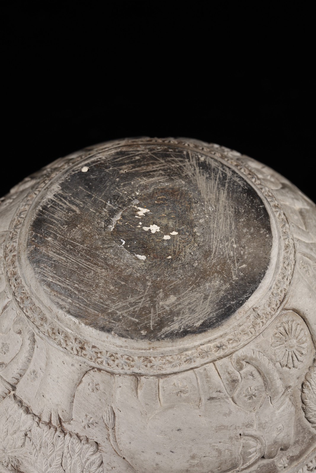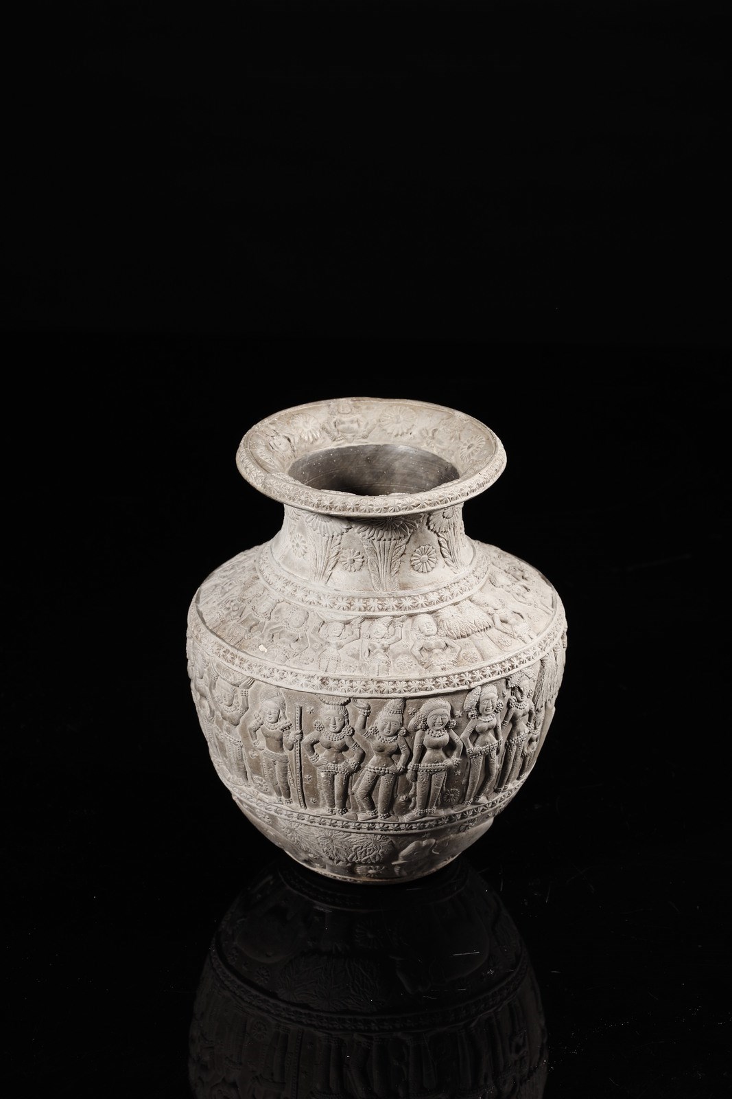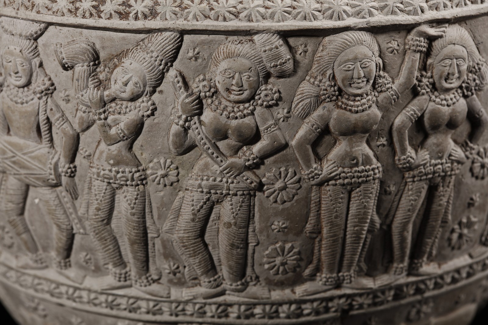 India, Bengala occidentale, periodo Shunga, I secolo a.C. - I secolo d.C. . Cm 17,00 x 21,00. Vaso per acqua (lota) dalla classica forma con corpo globulare, collo cilindrico e bocca estroflessa. L'esterno è finemente intagliato e suddiviso in quattro registri separati da sottili bande floreali. Sulla base troviamo elefanti, simbolo di prosperità, tra alberi; i due registri centrali sono occupati da Yaksha e Yakshini, ovvero spiriti della natura maschili e femminili intenti in occupazioni ludiche canti e balli; il collo è invece riservato a decorazioni fitomorfe.