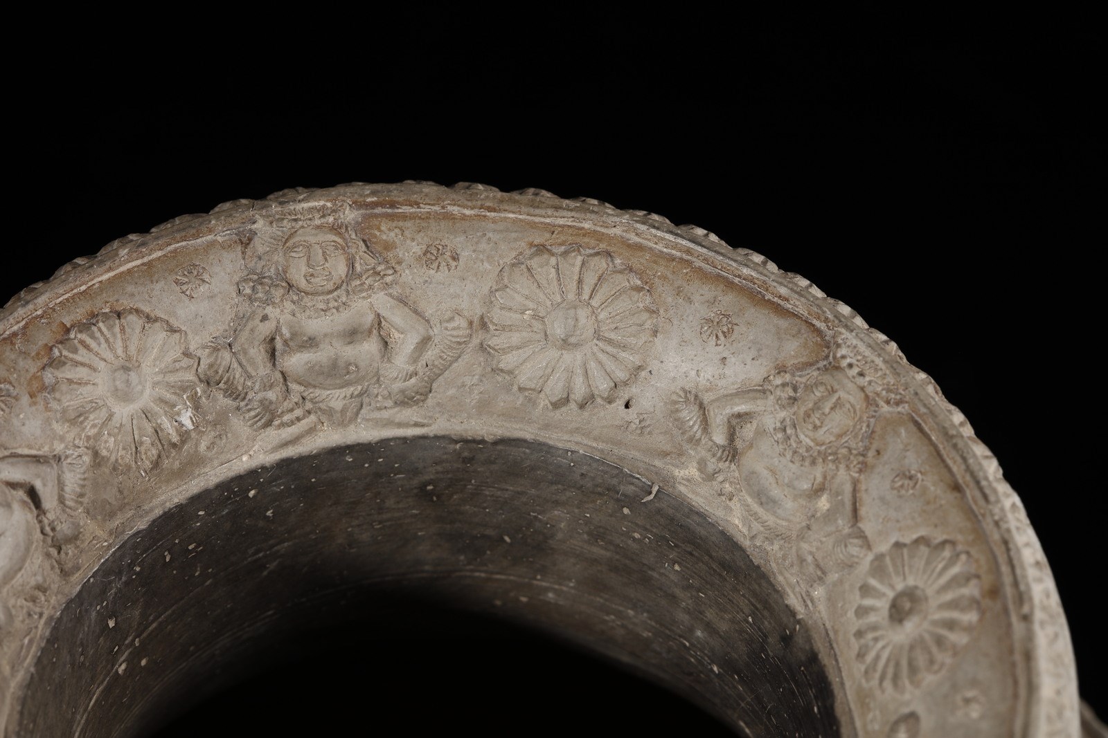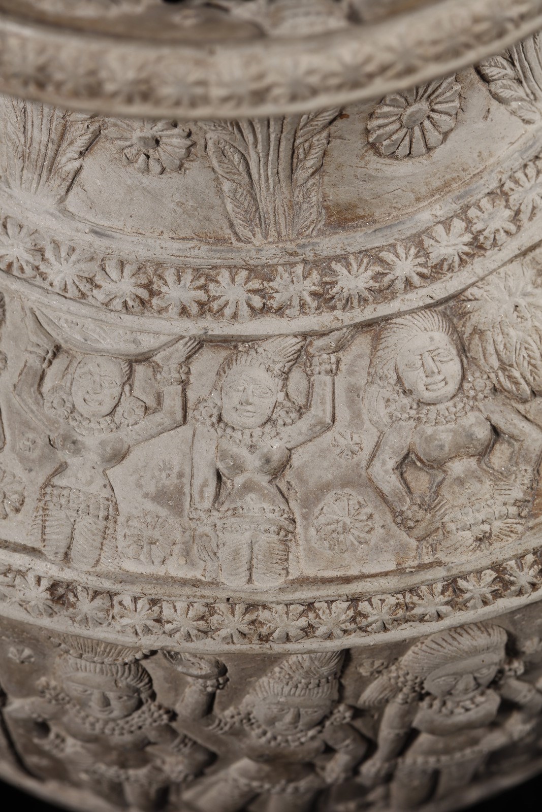 Arte Indiana - Vaso (lota) Chandraketugarh in terracotta modellato con Yaksha e Yakshini India, Bengala occidentale, periodo Shunga, I secolo a.C. - I secolo d.C.