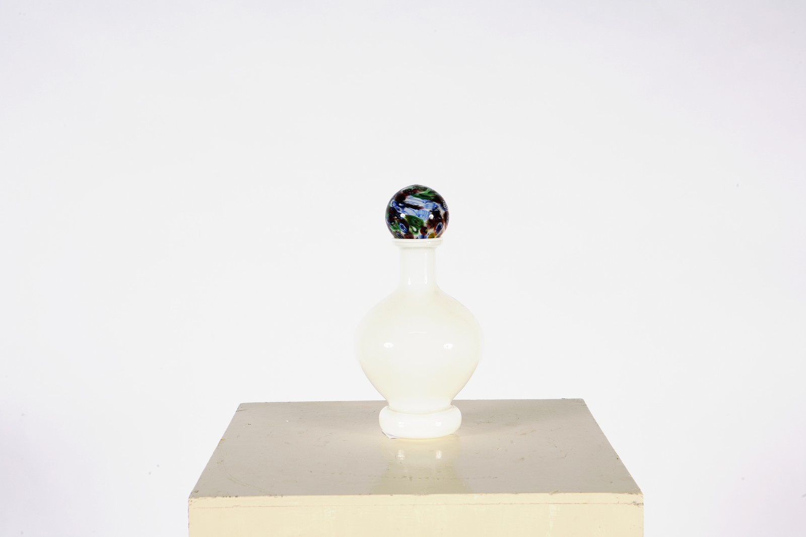 Lot 57 | PRODUZIONE MURANESE. Bottiglia in vetro lattimo, tappo in vetro multicolore....