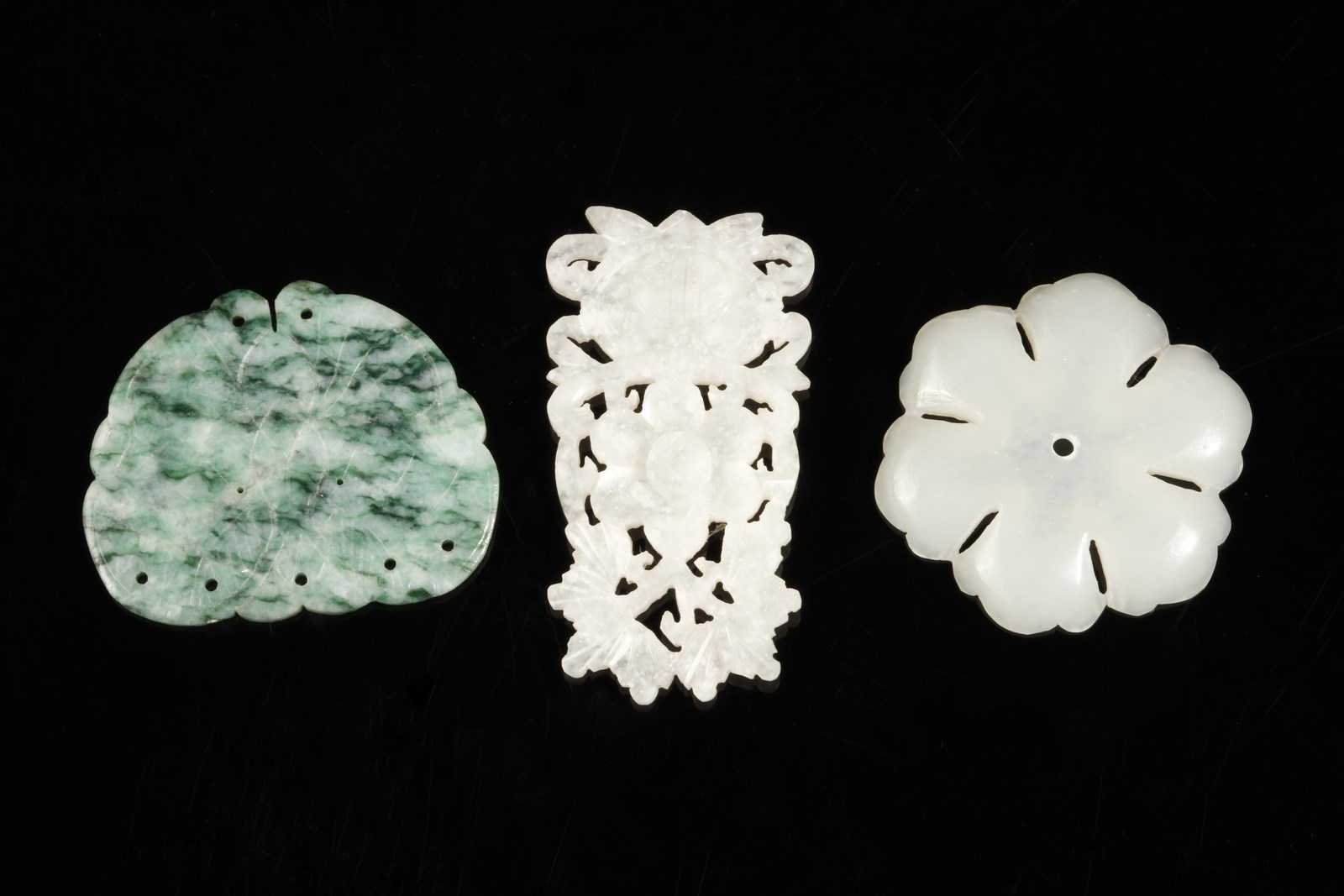 Cina, XX secolo . . Cm 6,00. Gruppo di accessori da abito composto da: un intaglio in giada bianca lavorata a traforo a motivo floreale; un fiore di loto stilizzato in giada verde marezzata ed un intaglio in giada bianca raffigurante un fiore a sei petali.