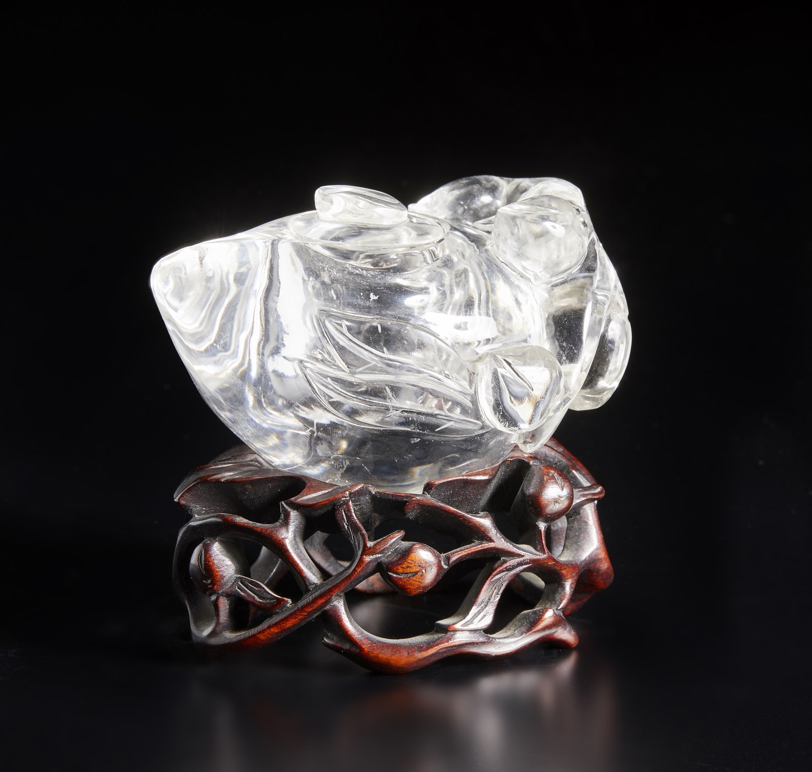 Cina, XX secolo. . Cm 10,50 x 5,00. Pesca realizzata in cristallo di rocca su base in legno (la misura indicata si riferisce solo all'intaglio in pietra dura).