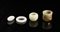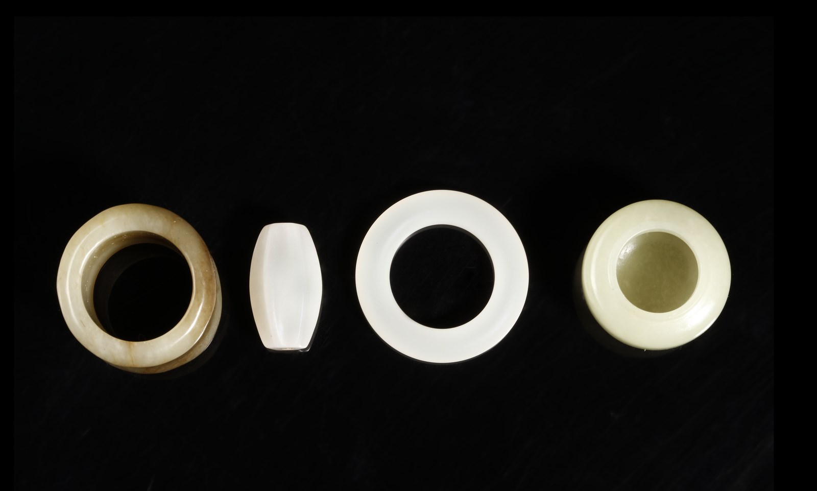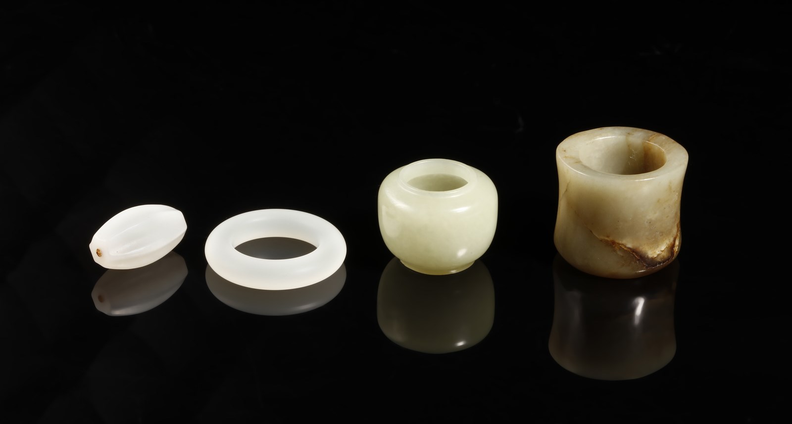 Cina, XIX - XX secolo . . Cm 3,40. Il lotto è composto da: un piccolo vaso cilindrico in giada celadon, un elemento di collana scannellato in giada bianca, un anello in giada bianca ed un anello da arciere in giada marezzata.