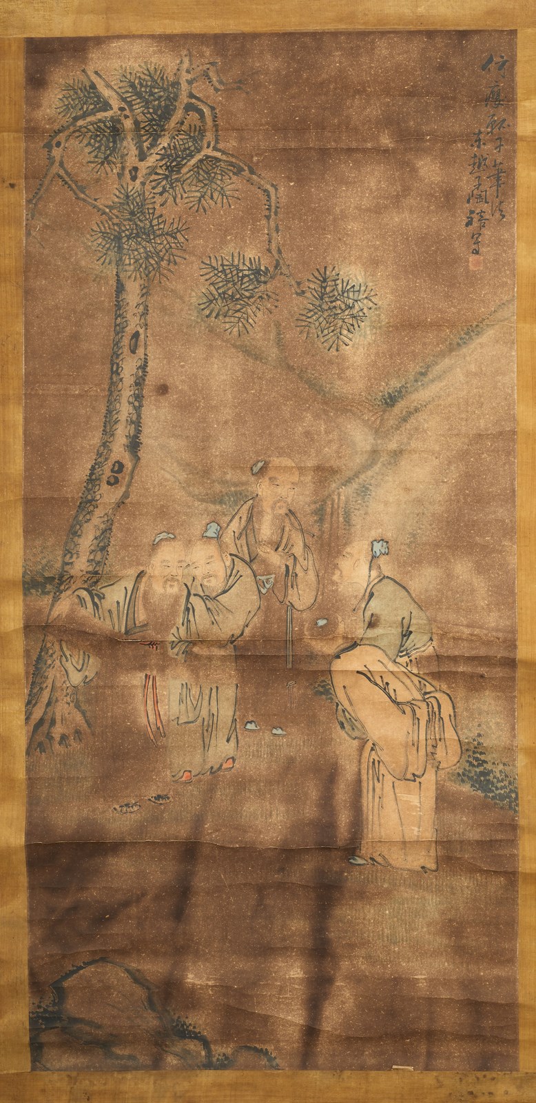 Cina, dinastia Qing, XIX secolo . . Cm 58,00 x 121,00. Rotolo verticale su carta raffigurante un gruppo di monaci buddisti in conversazione sotto un grande albero di pino.