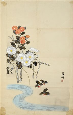 Cina, dinastia Qing, inizi XX secolo. . Cm 61,00 x 95,00. Rotolo verticale entro cornice, inchiostro colorato su carta, raffigurante fiori in prossimità di un ruscello. Cornice presente