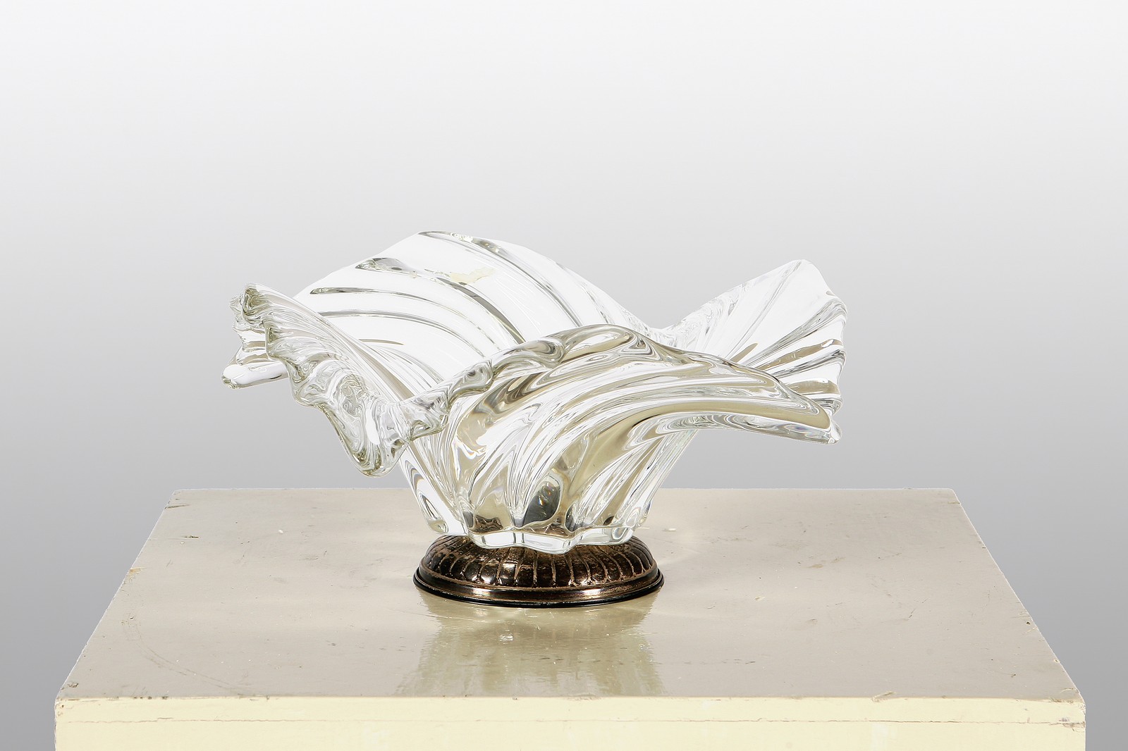 ANONIMO. Svuotatasche in spesso vetro trasparente, su base di latta. Vide poche in thick Murano glass. Vetro di Murano. Cm 14x27x27.