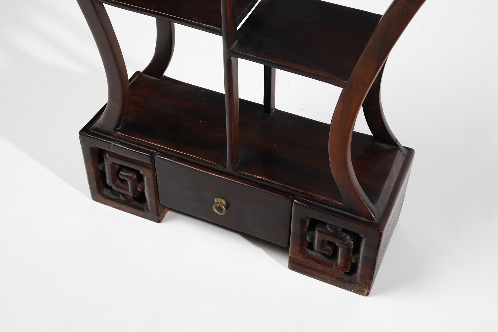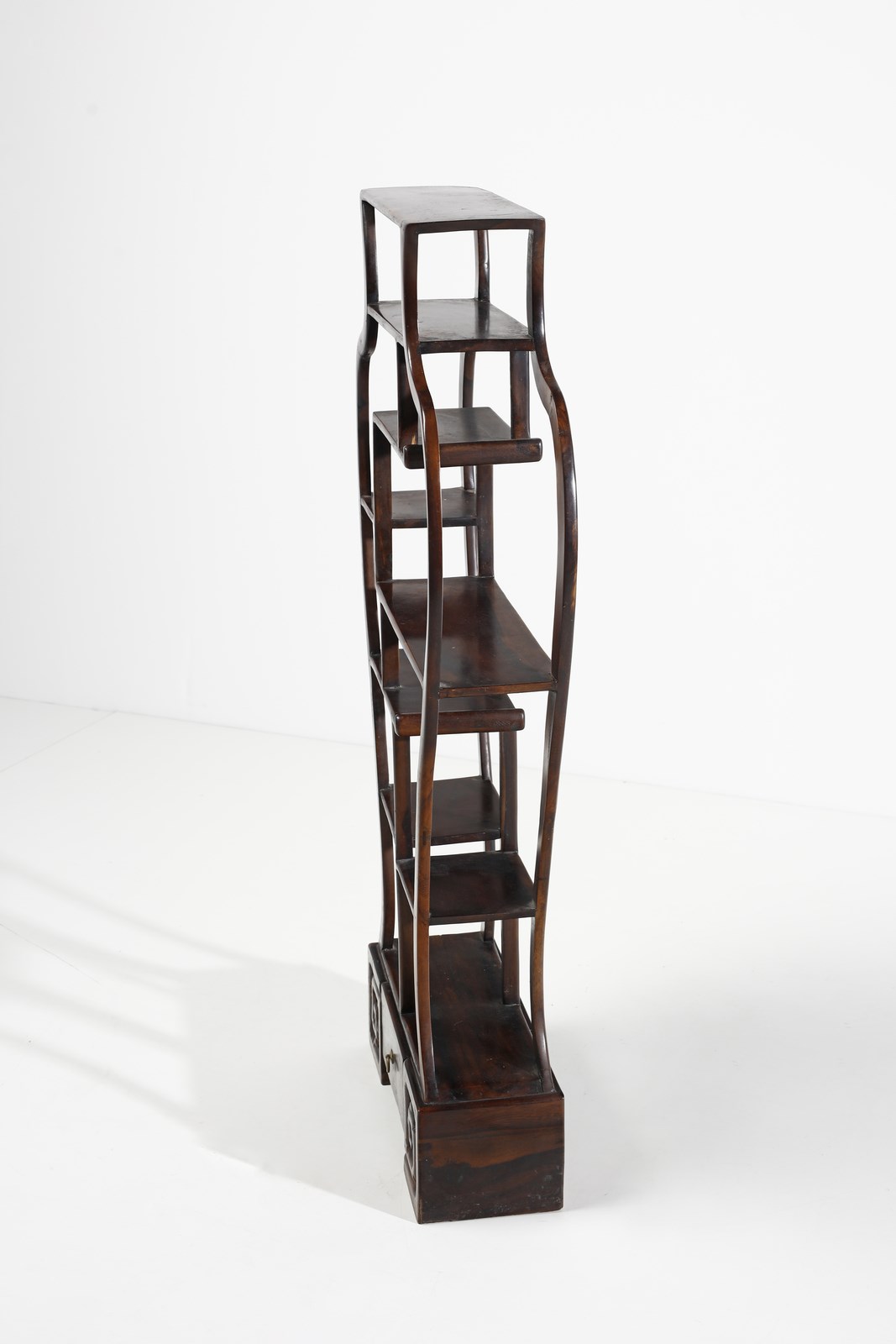 Cina, inizi XX secolo . . Cm 70,00 x 126,00 x 17,00. Bello scaffale sagomato in forma di vaso di fiori, completo di ripiani e cassetti sulla base.