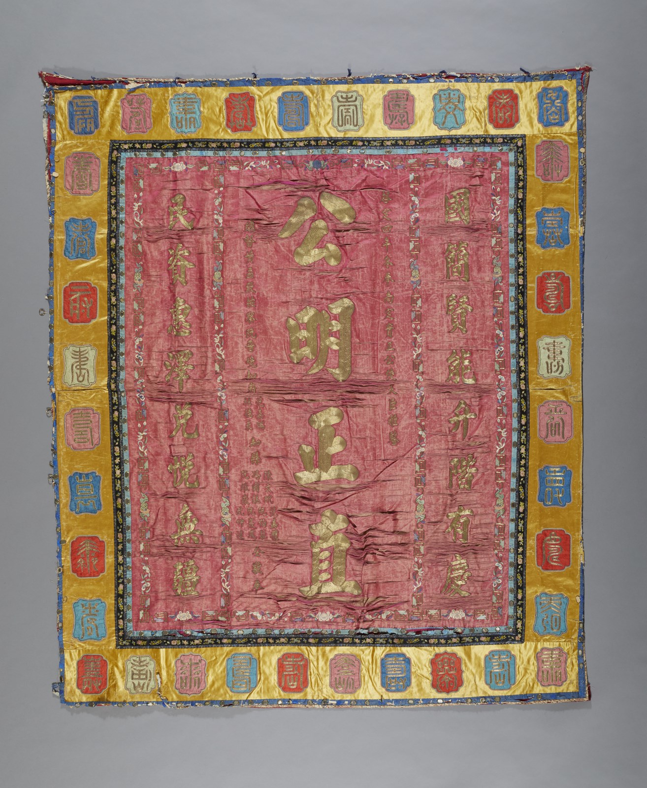 Cina, dinastia Qing, XIX secolo. . Cm 177,00 x 208,00. Ricamo di grandi dimensioni in seta policroma con ricamo in seta e filo d'oro di iscrizioni e disegni.