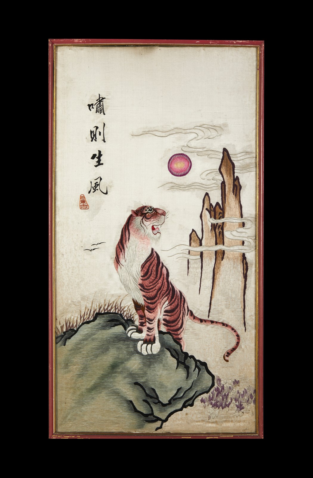 Serie di 4 ricami su seta raffiguranti personaggi ed una tigre (99 X 53 cm)