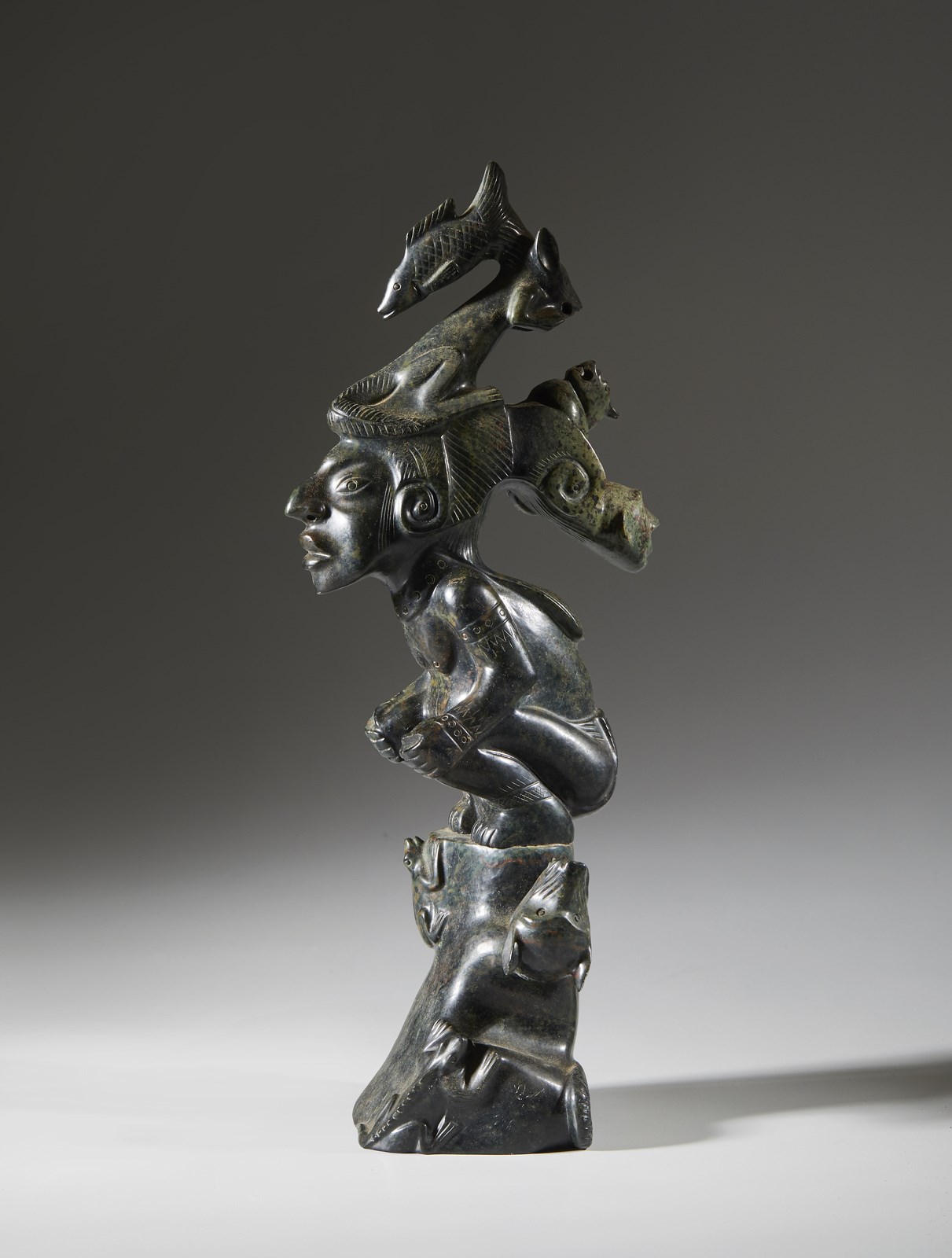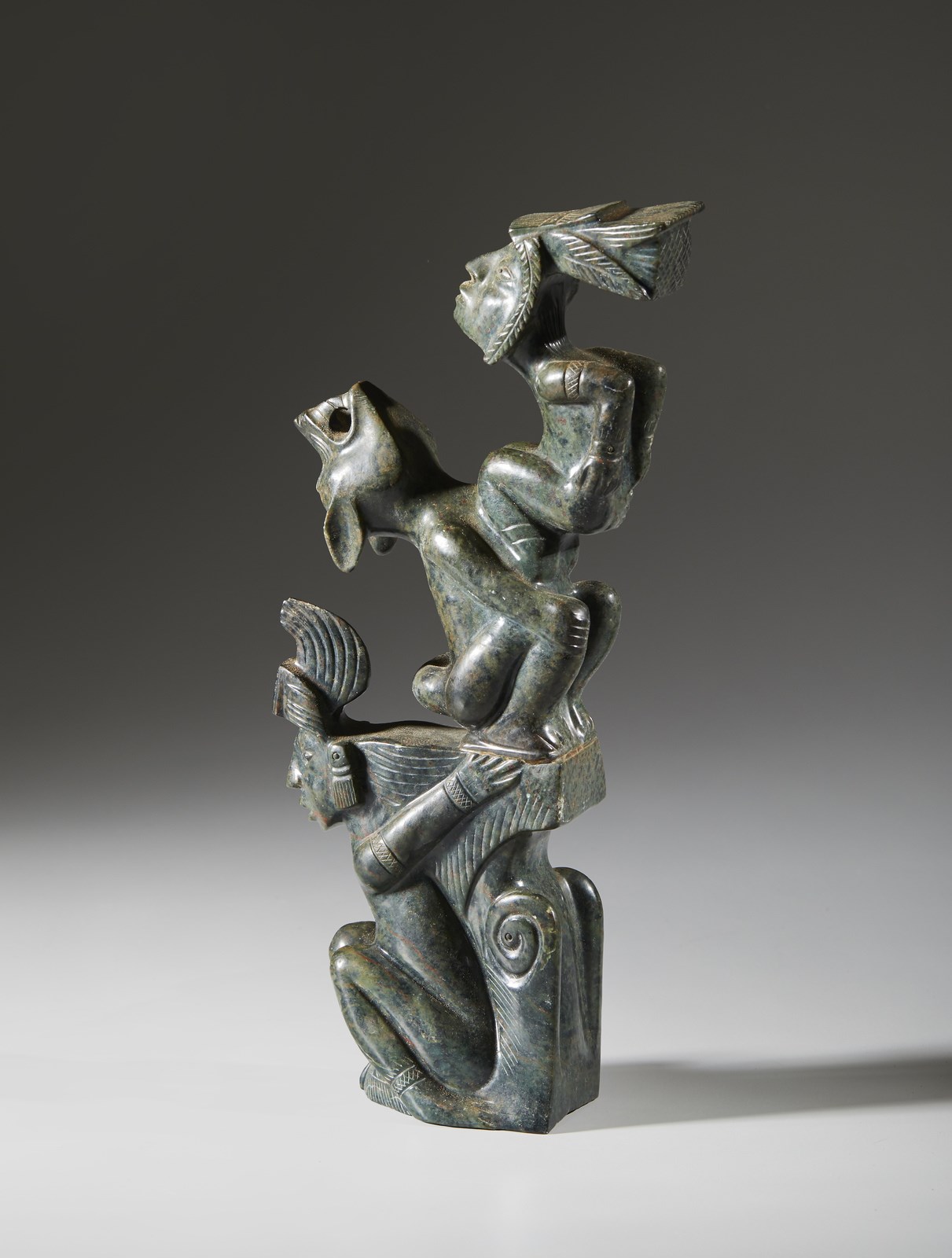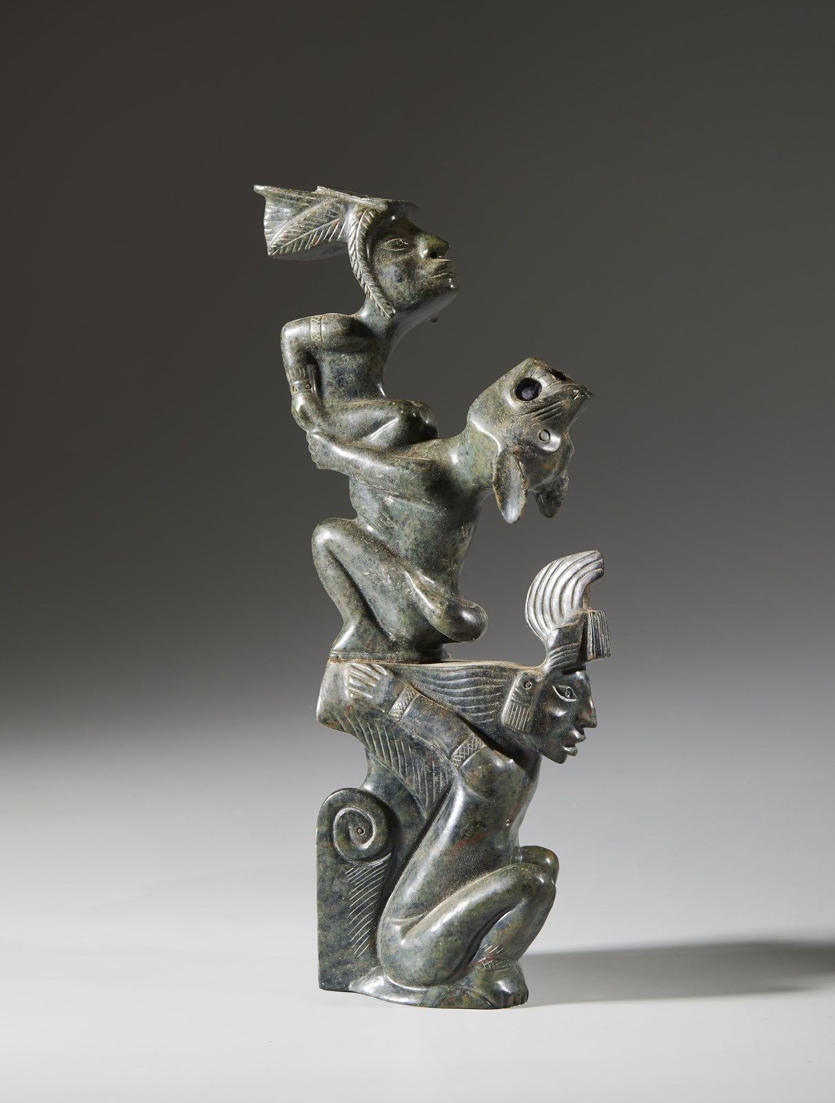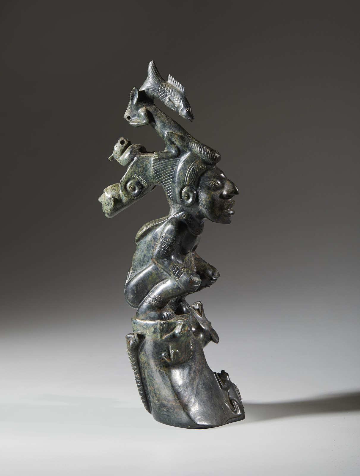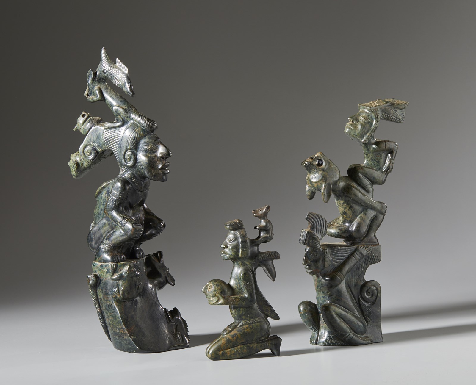 . Tre intagli in giada. . Cm 7,50 x 34,00. Lotto composto da tre statuette in giada verde marezzata realizzate in stile precolombiano.