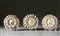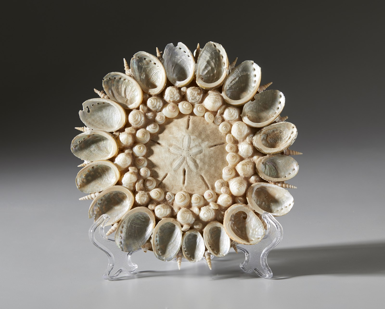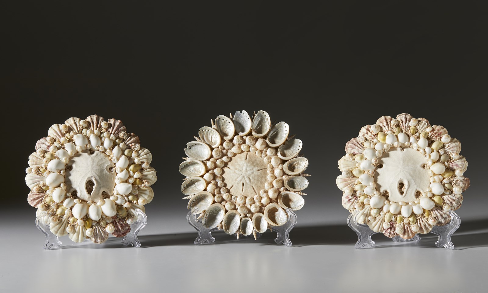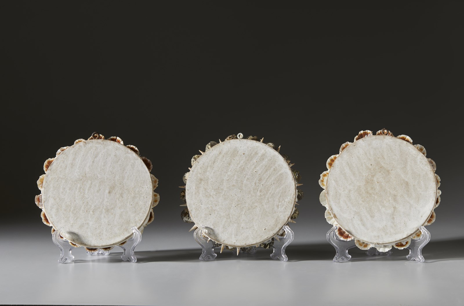 . Tre rosoni in conchiglie . . Cm 24,50 x 24,50. Tre manufatti realizzati con gusci di conchiglia e di riccio marino a formare complessi girali decorativi.