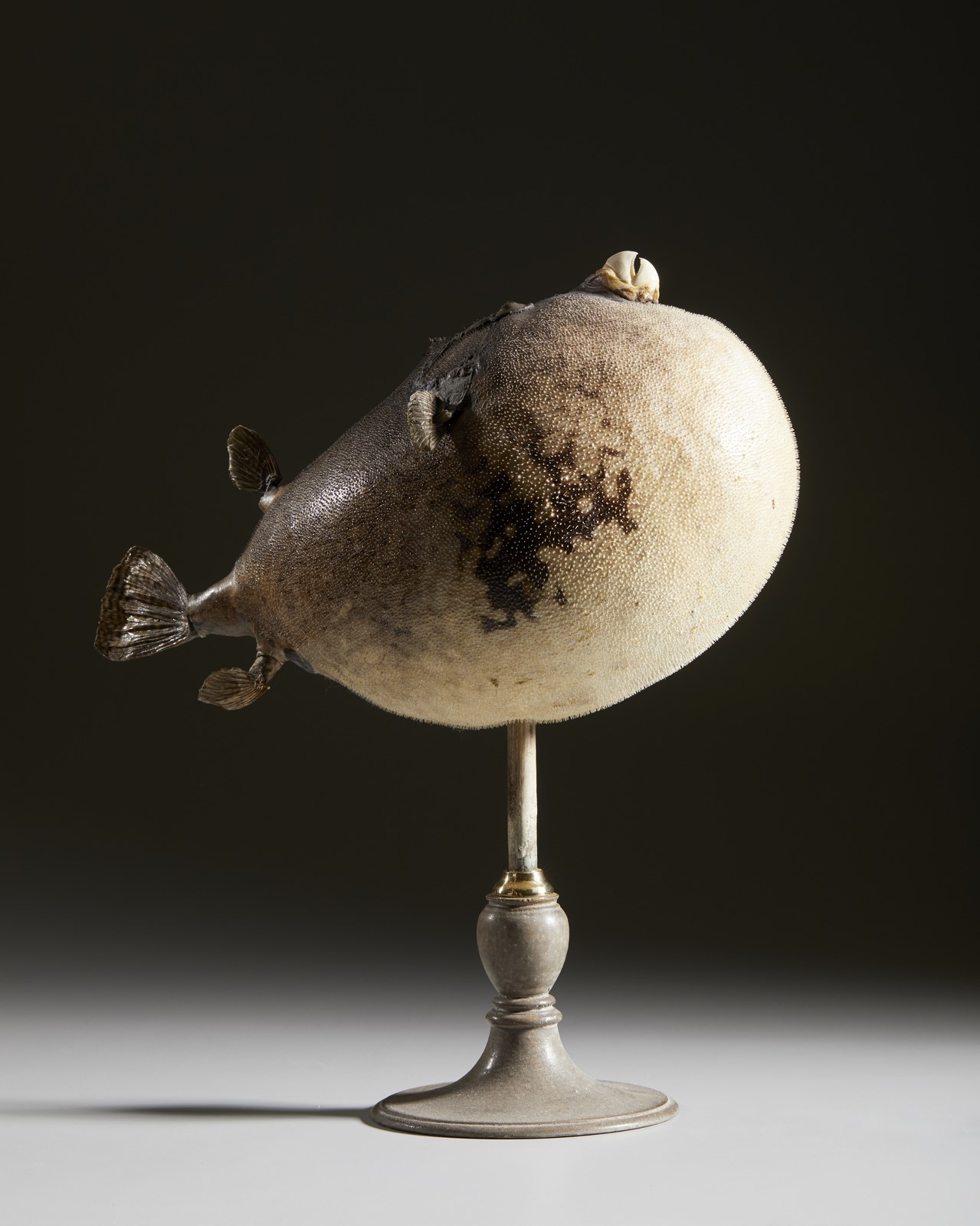 . Pesce palla essiccato . . Cm 26,00 x 40,00. Soprammobile realizzato con un esemplare adulto di tetraodontide montato su base in legno tornito. Il pesce palla, conosciuto in giappone con il nome di fugu, contiene una potente neurotossina che rende le sue carni altamente tossiche se non preventivamente private degli organi che la contengono, soprattutto fegato, interiora e pelle.