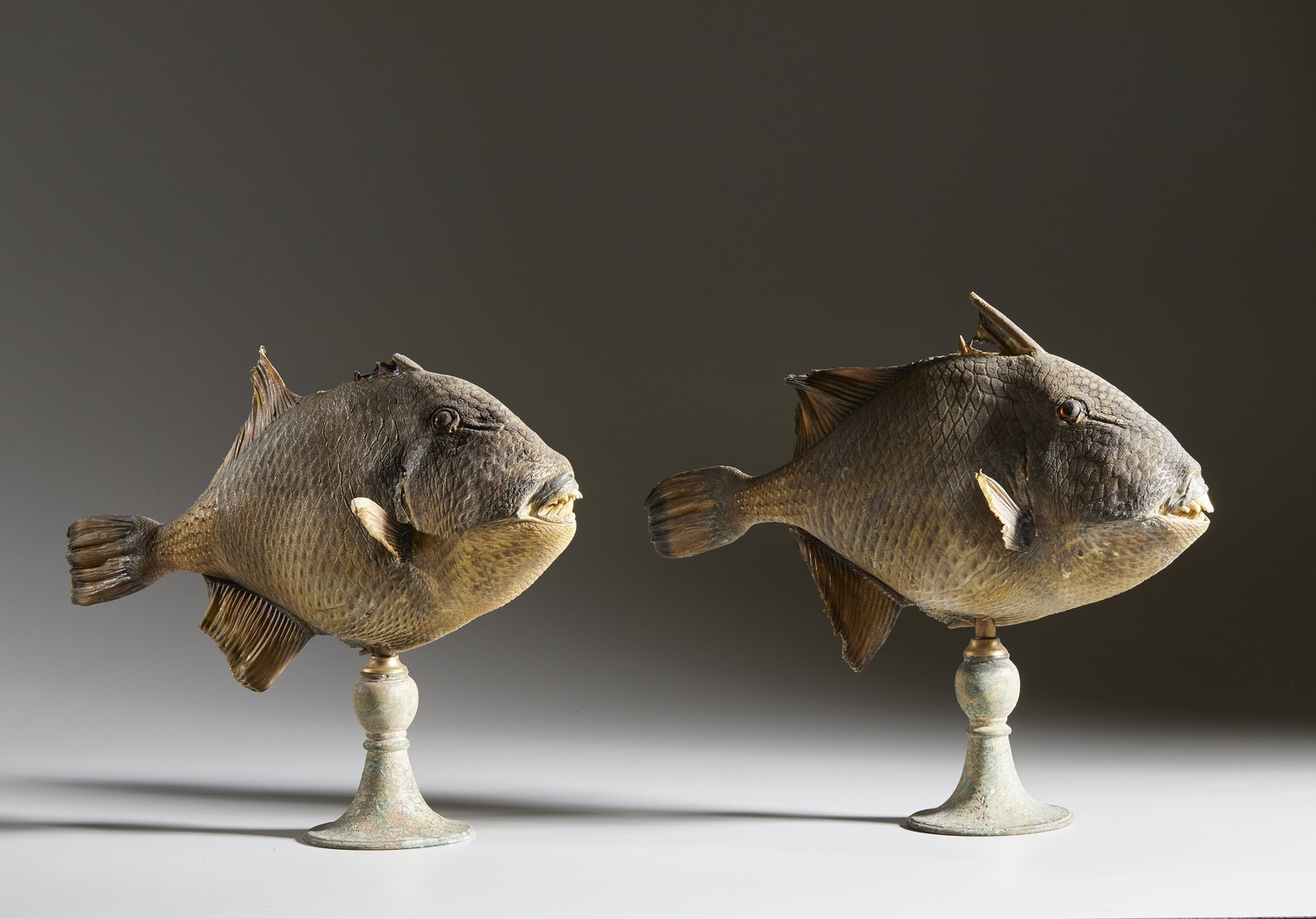 . Coppia di pesci balestra . . Cm 43,00 x 20,00. Due esemplari di pesce balestra (balistes capriscus) montati su basette tornite.