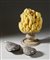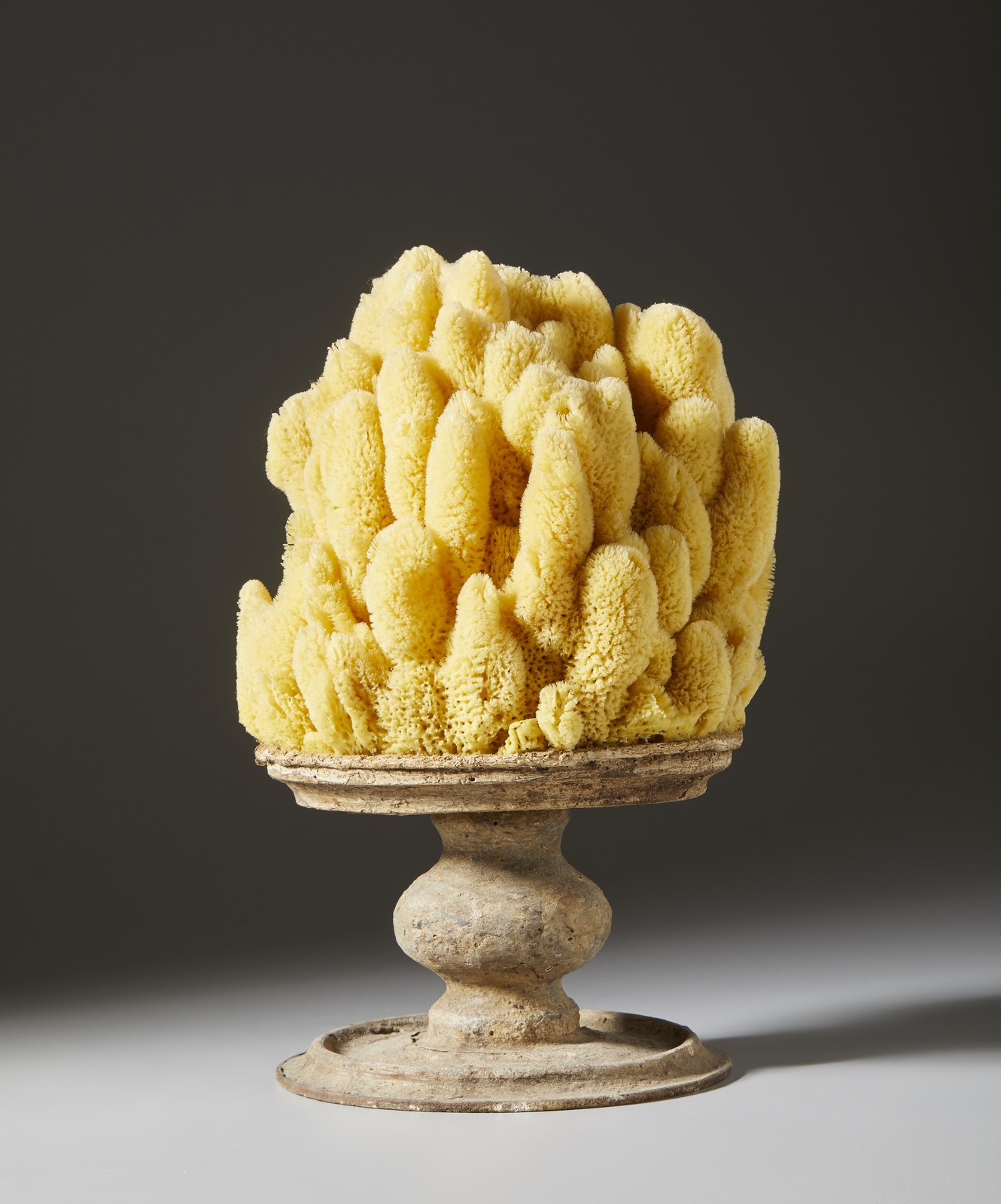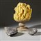 . Spugna marina e conchiglie . . . Lotto composto da grande porifera marina montata su base in legno tornito e due conchiglie bivalvi spugna: 24x25,5