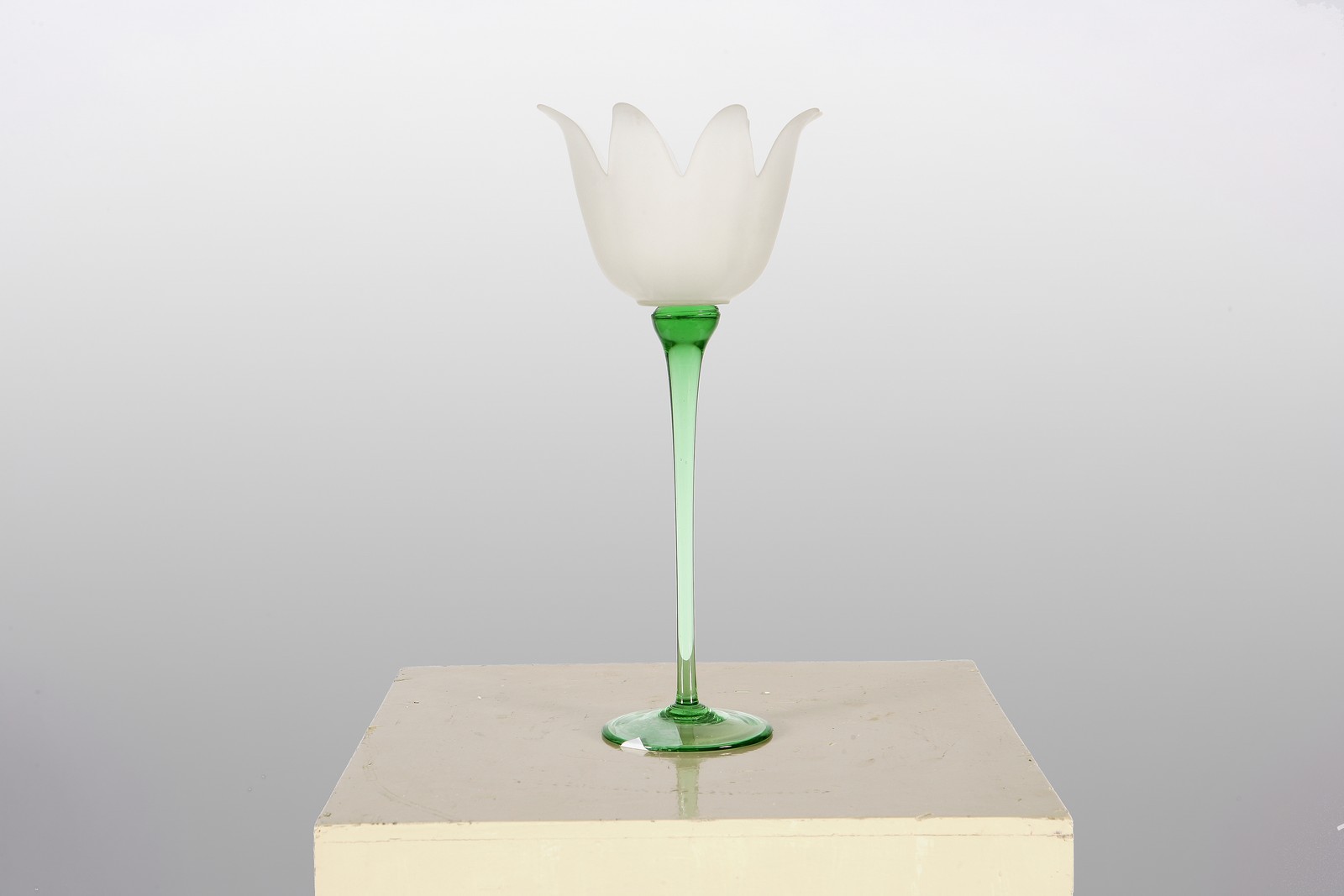 ANONIMO. Fiore portadolci in vetro colorato. Sweet holder in form of a flower in colored glass. Vetro di Murano. Cm 18x38. 1990.