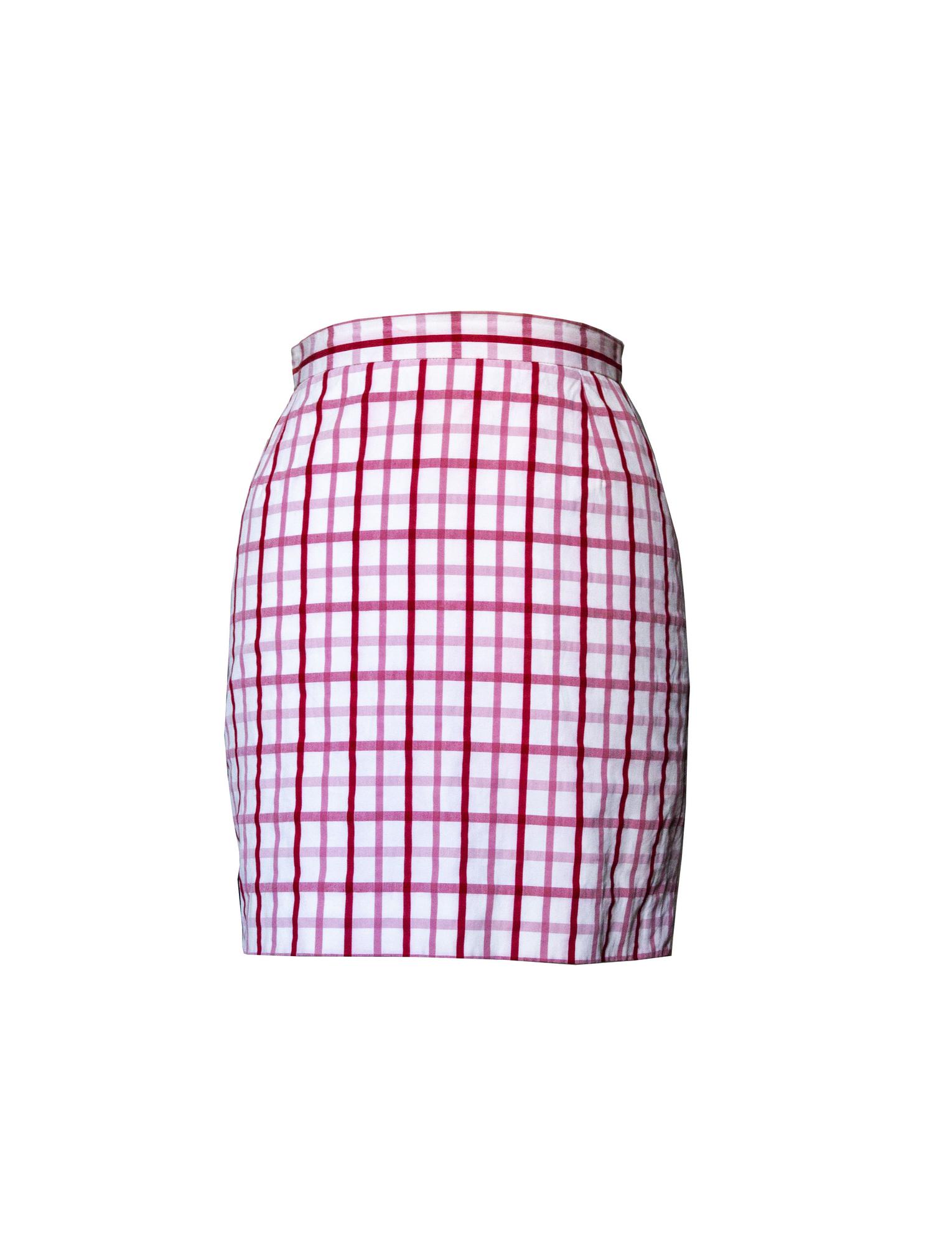 Completo tre pezzi giacca monopetto con giacca foderata, camicia e minigonna per questo completo in seersucker di cotone. Bottoni con logo 'Orb'. Made in Italy negli anni '90. Taglia IT 42. Perfettamente conservato.
