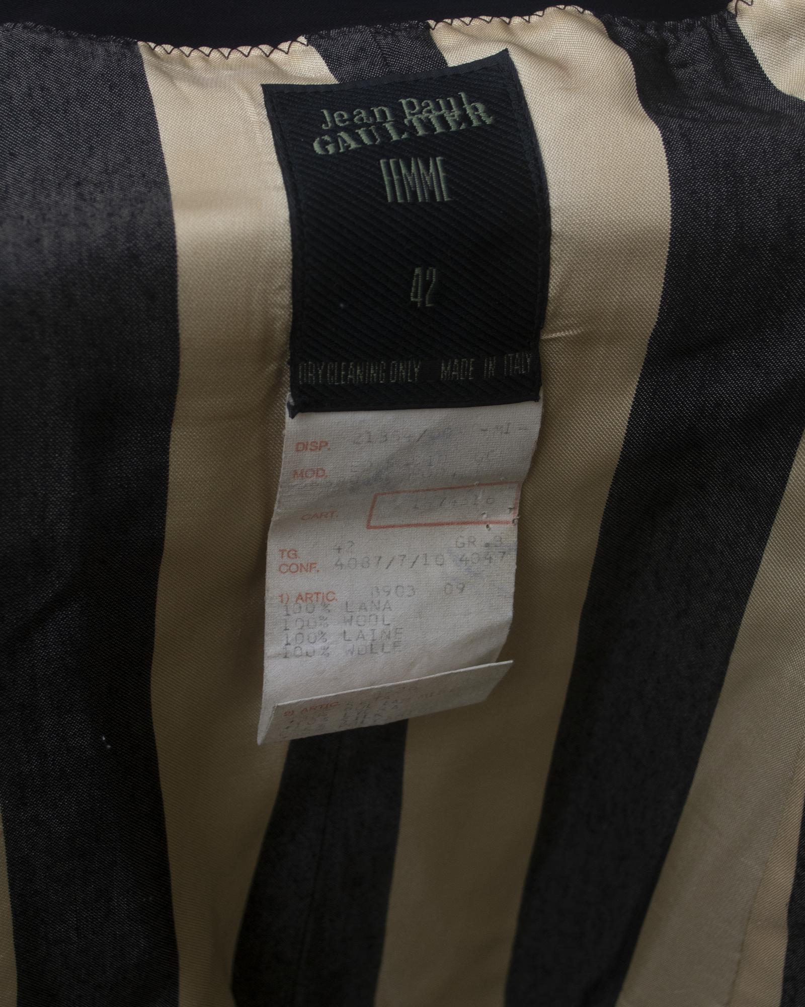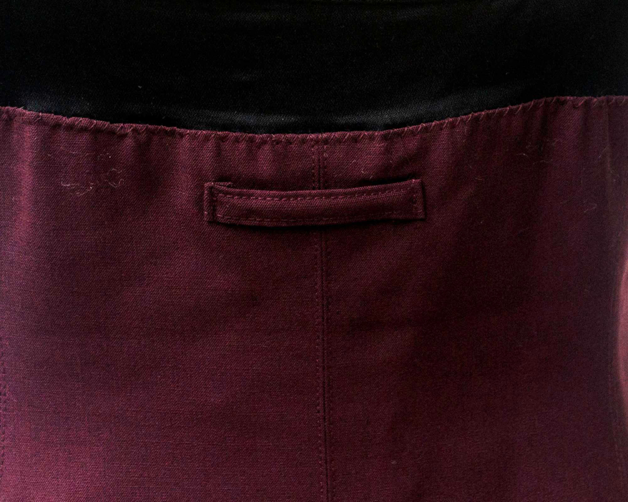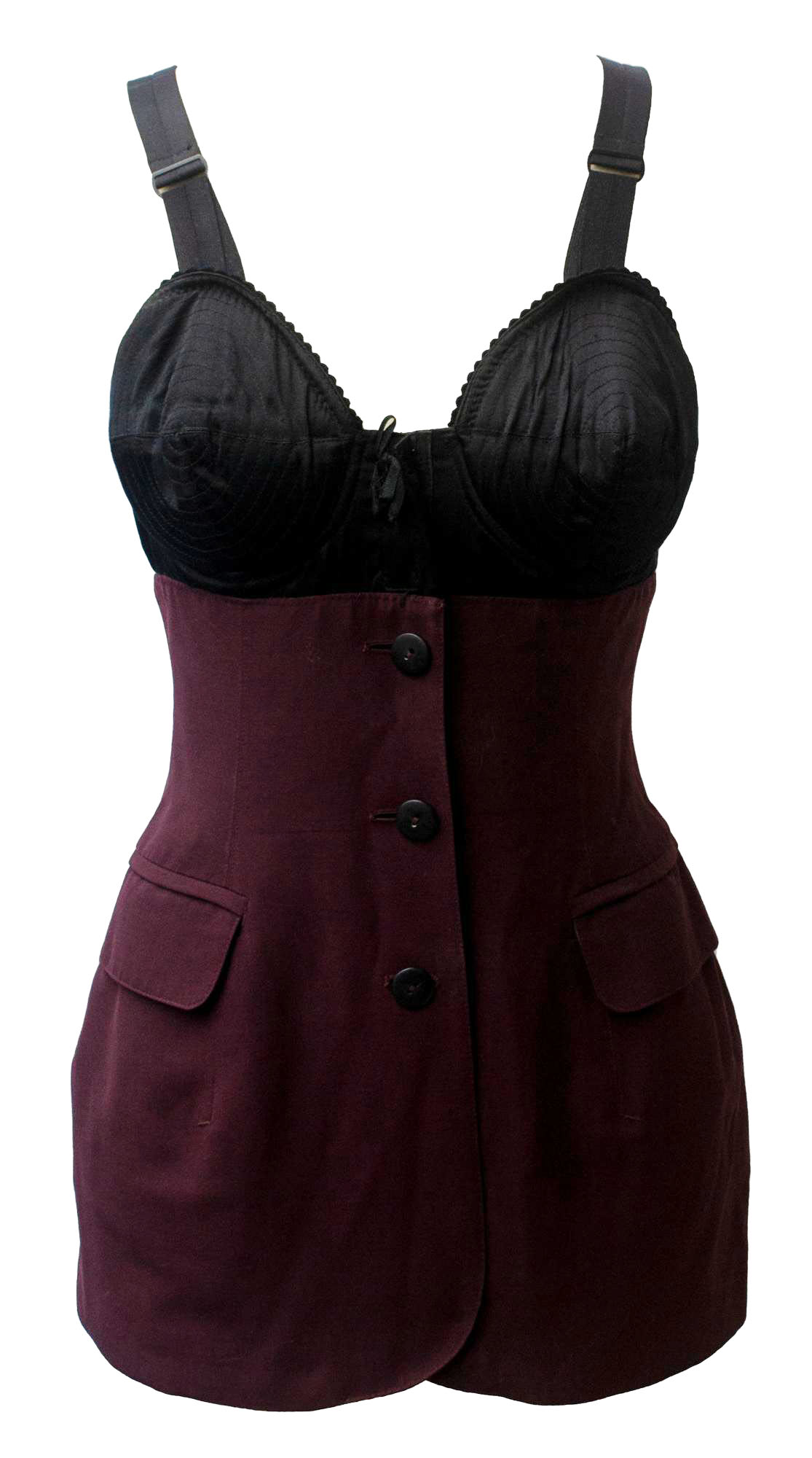 Seta color bordeaux per questo top nel quale, il classico dettaglio sartoriale di una giacca e' mixato ad un reggiseno intimo trapuntato, meglio noto come 'Cone Bra'. Fodera a righe. Due tasche con patta. Prodotto in Italia alla fine degli anni '80. Taglia IT 42. Ben conservata.