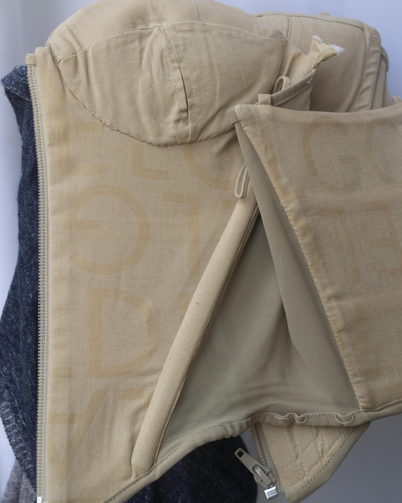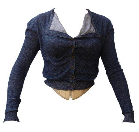 Blu melange knitwear cardigan attached to a stretch and splinted corset with big padded breast cups and center front zip. Made in England, Gold Label collection in the 90's. UK size 10. Perfectly preserved.