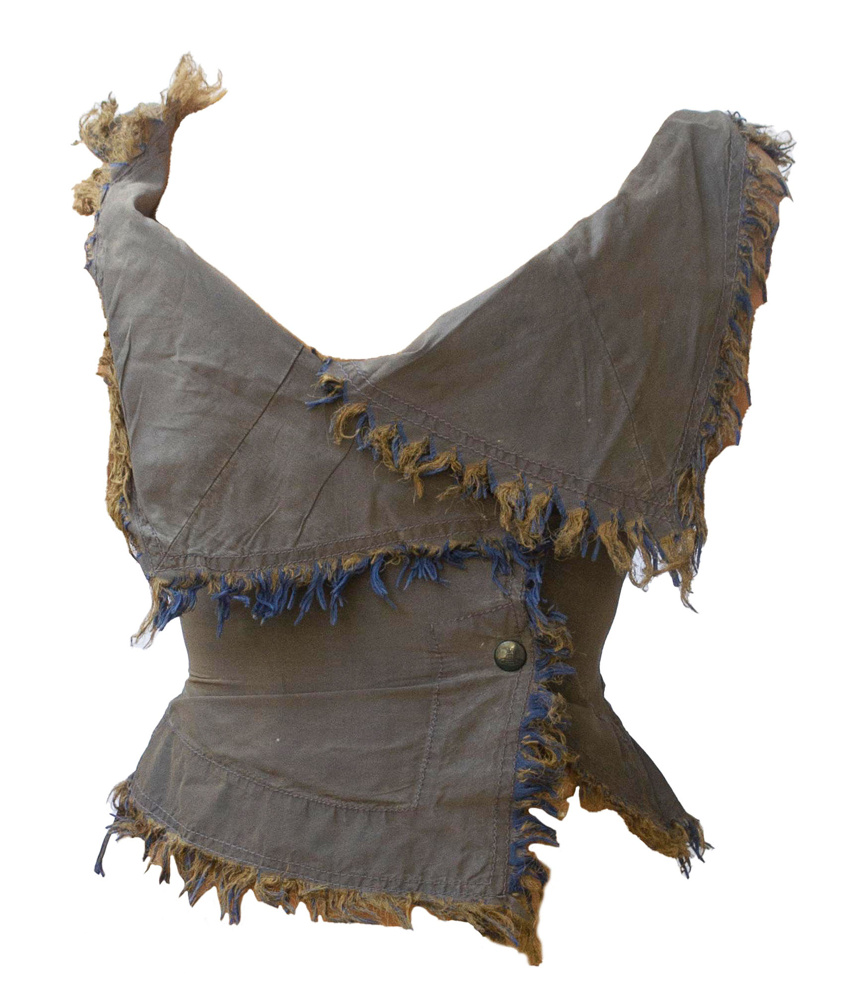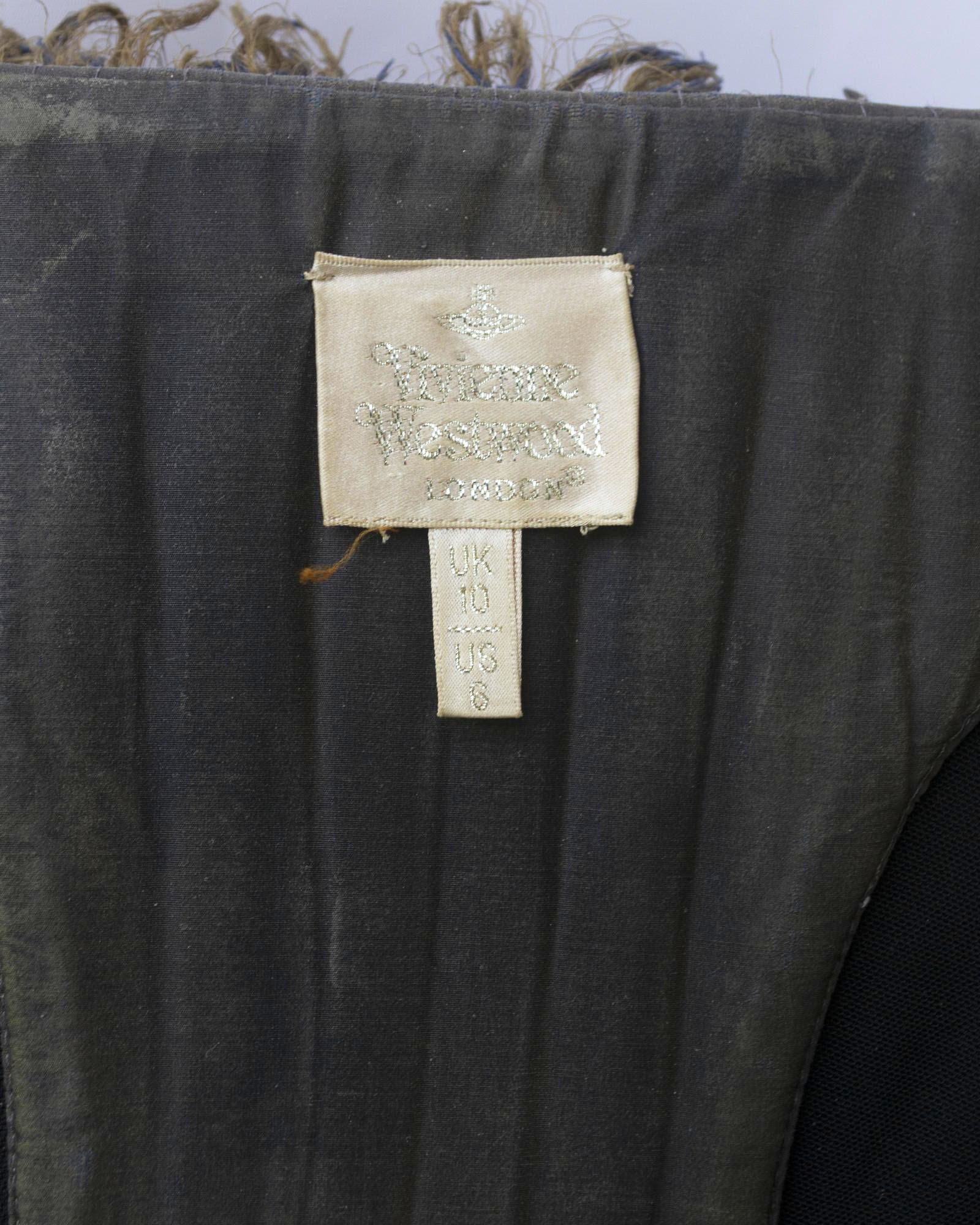 Fitted top in iridescent blue-mud washed silk with internal fence bustier with central front opening with zip. Overlapping lacing, frayed edges. Since the 90s. UK size 10. Central zip closure on the back. Made in England. Perfectly preserved.