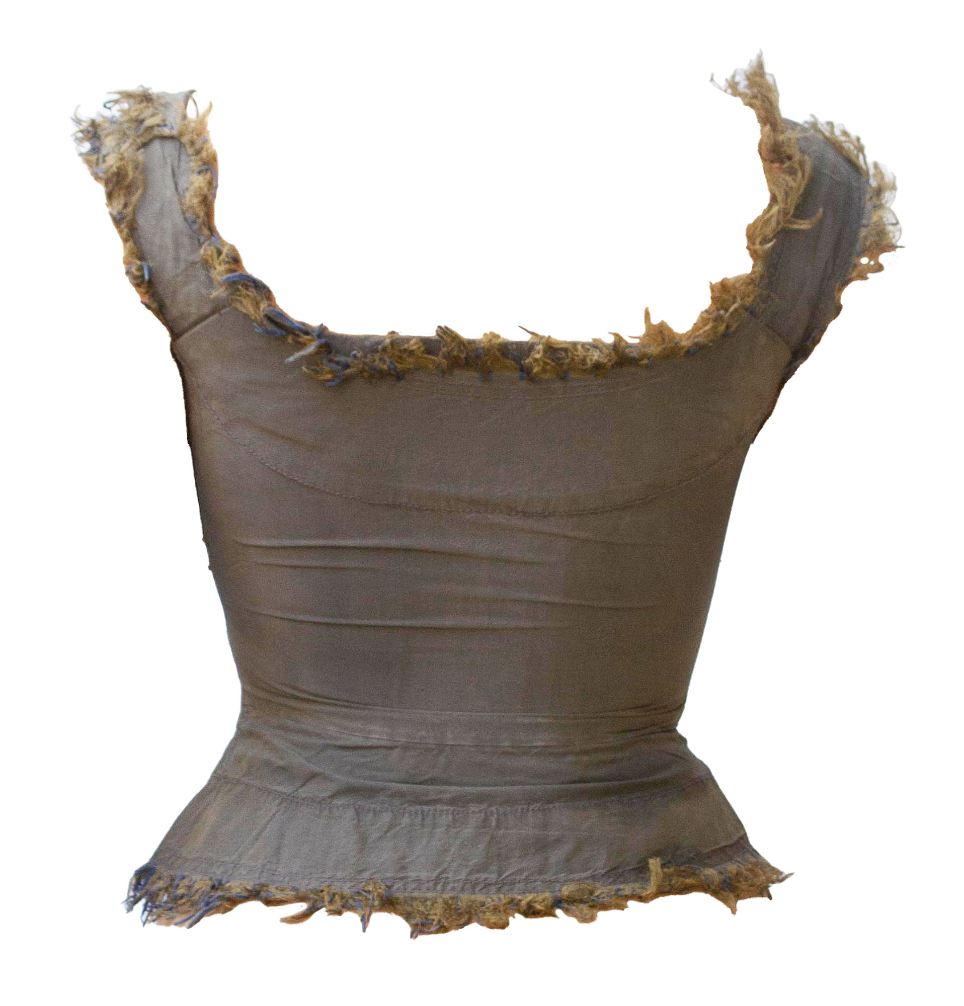Top aderente in seta lavata blu-fango cangiante con bustino interno steccato con apertura centrale frontale con zip. Allacciatura sovrapposta, bordi sfrangiati. Dagli anni '90. Taglia UK 10. Prodotto in Inghilterra. Perfettamente conservato.
