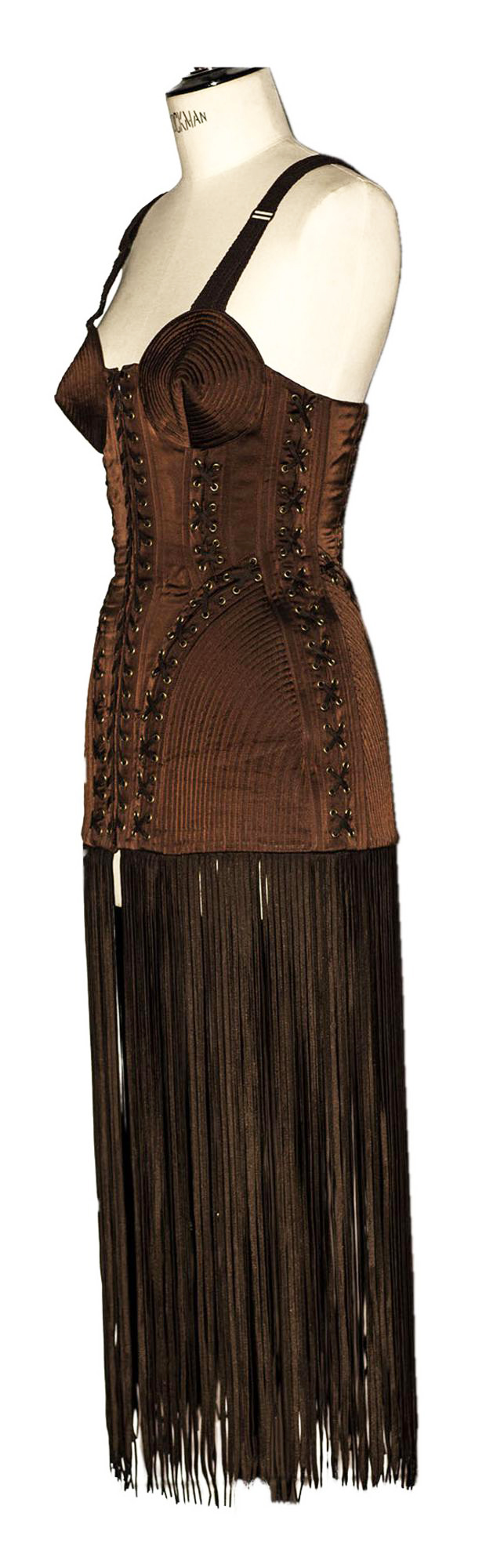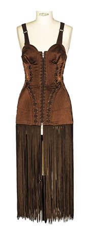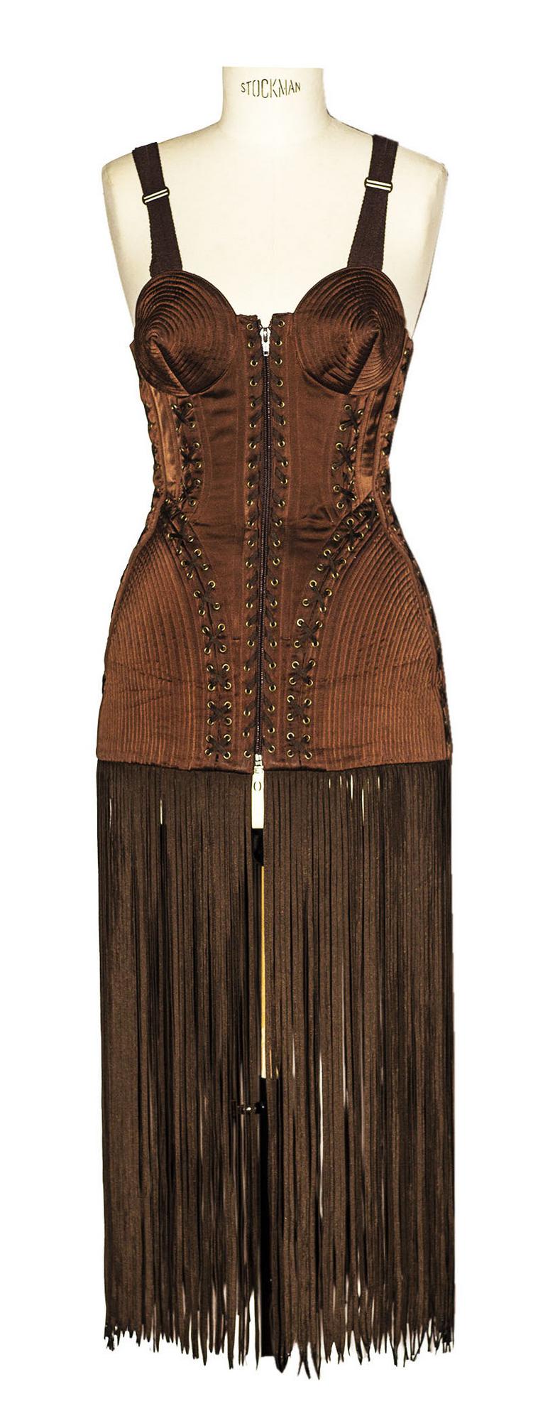 Esemplare corsetto cucito e decorato con intrecci e frange realizzate con stringhe di scarpe. Speciale per collezionisti. Parte della collezione realizzata per il 'Blonde Ambition World Tour' di Madonna. 1990. Taglia IT40, Made in Italy. Perfettamente conservato.