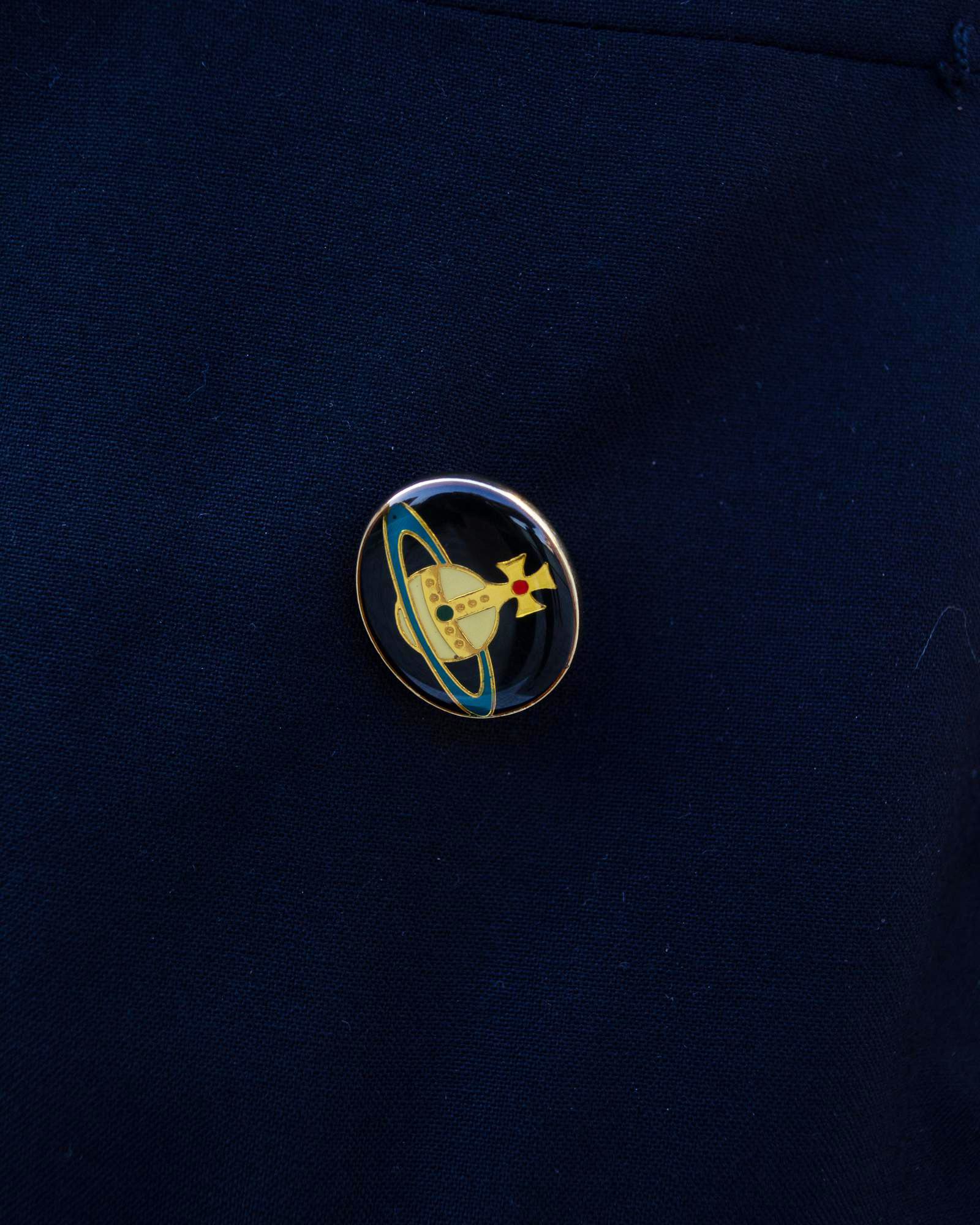 Abito realizzato in tessuto di lana mohair e cashmere Hield, con collo staccabile in organza di seta bianca e revers. Tasche a doppio filetto, bottoni smaltati con logo Orb. Fodera rosa, Made in England negli anni '90. Eccellente stato.