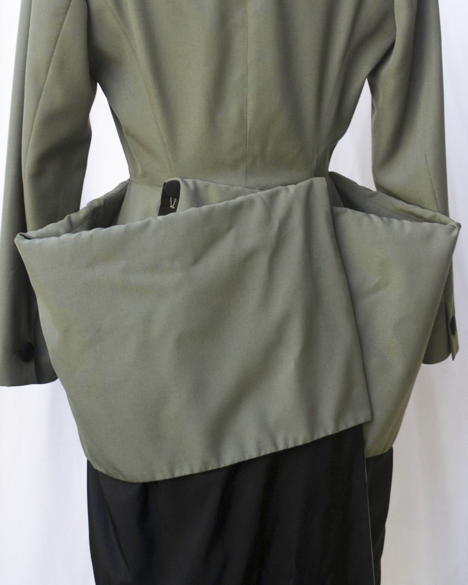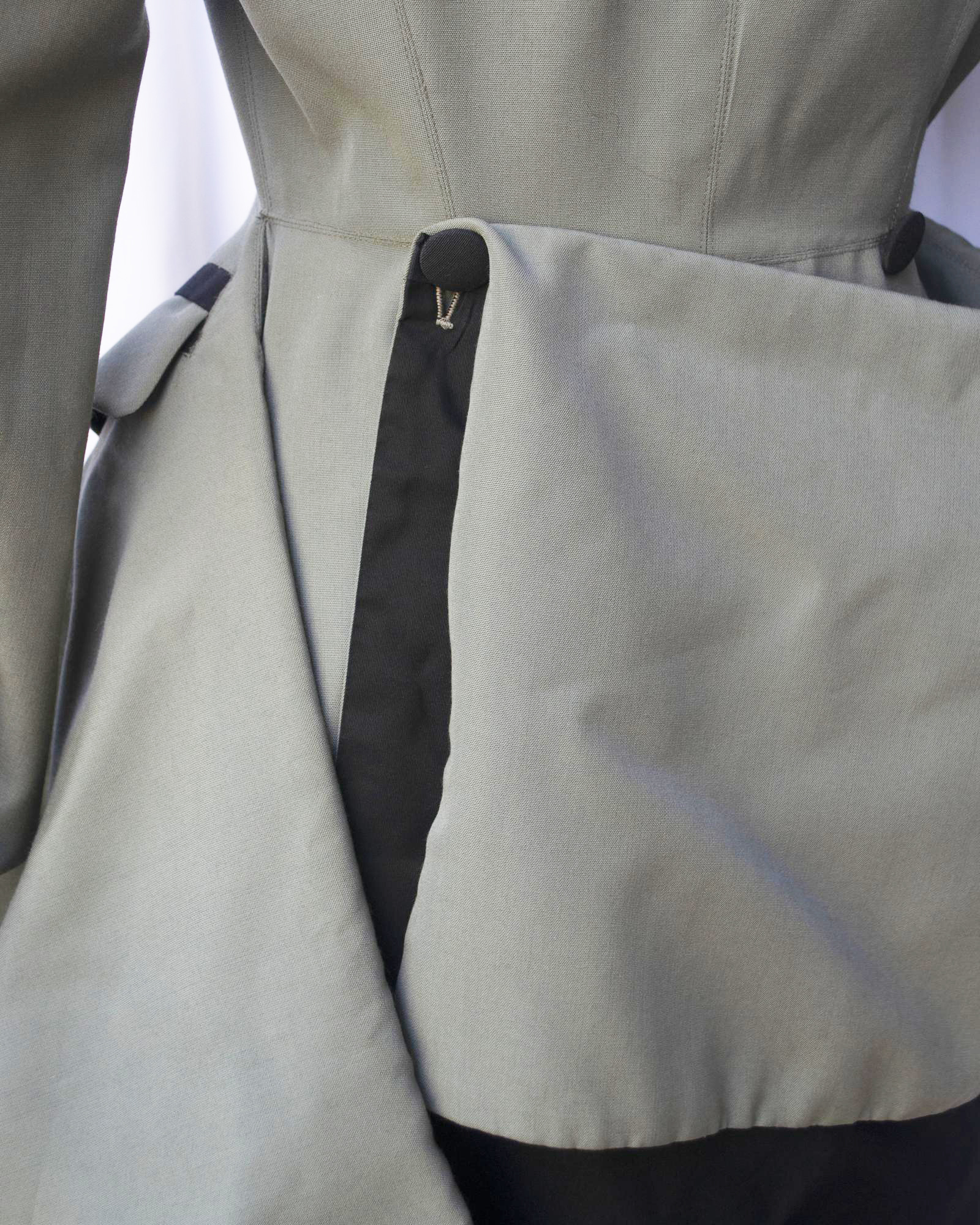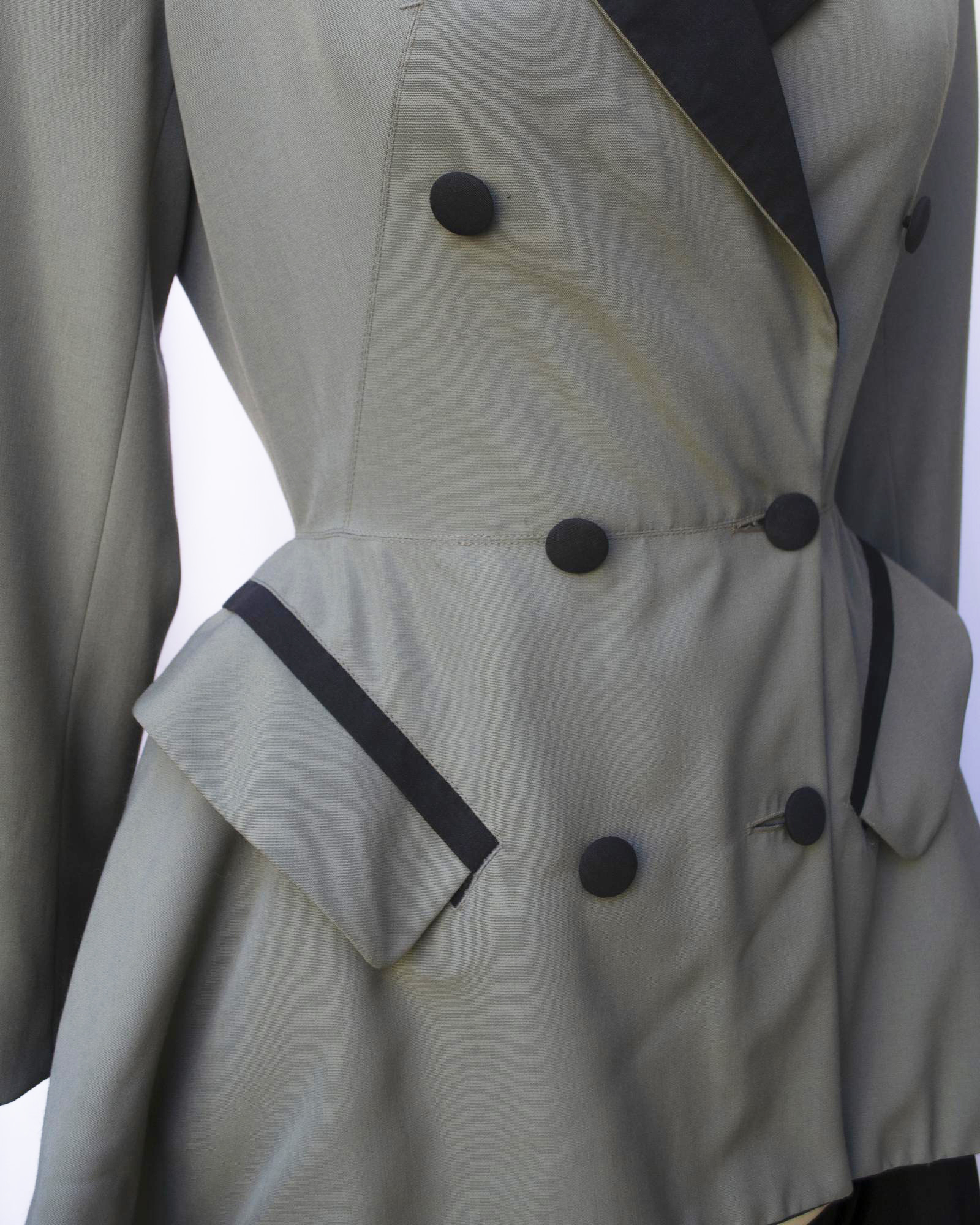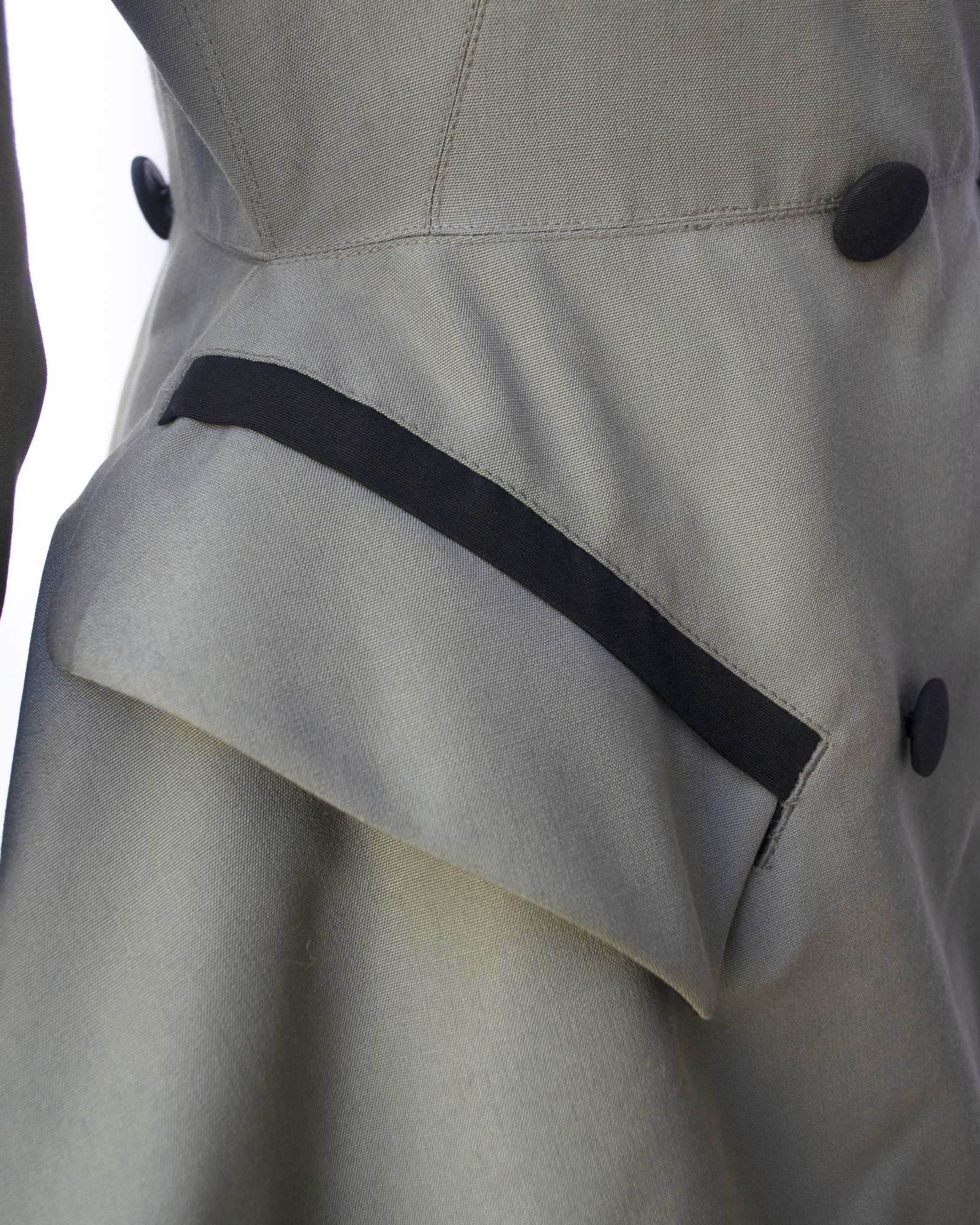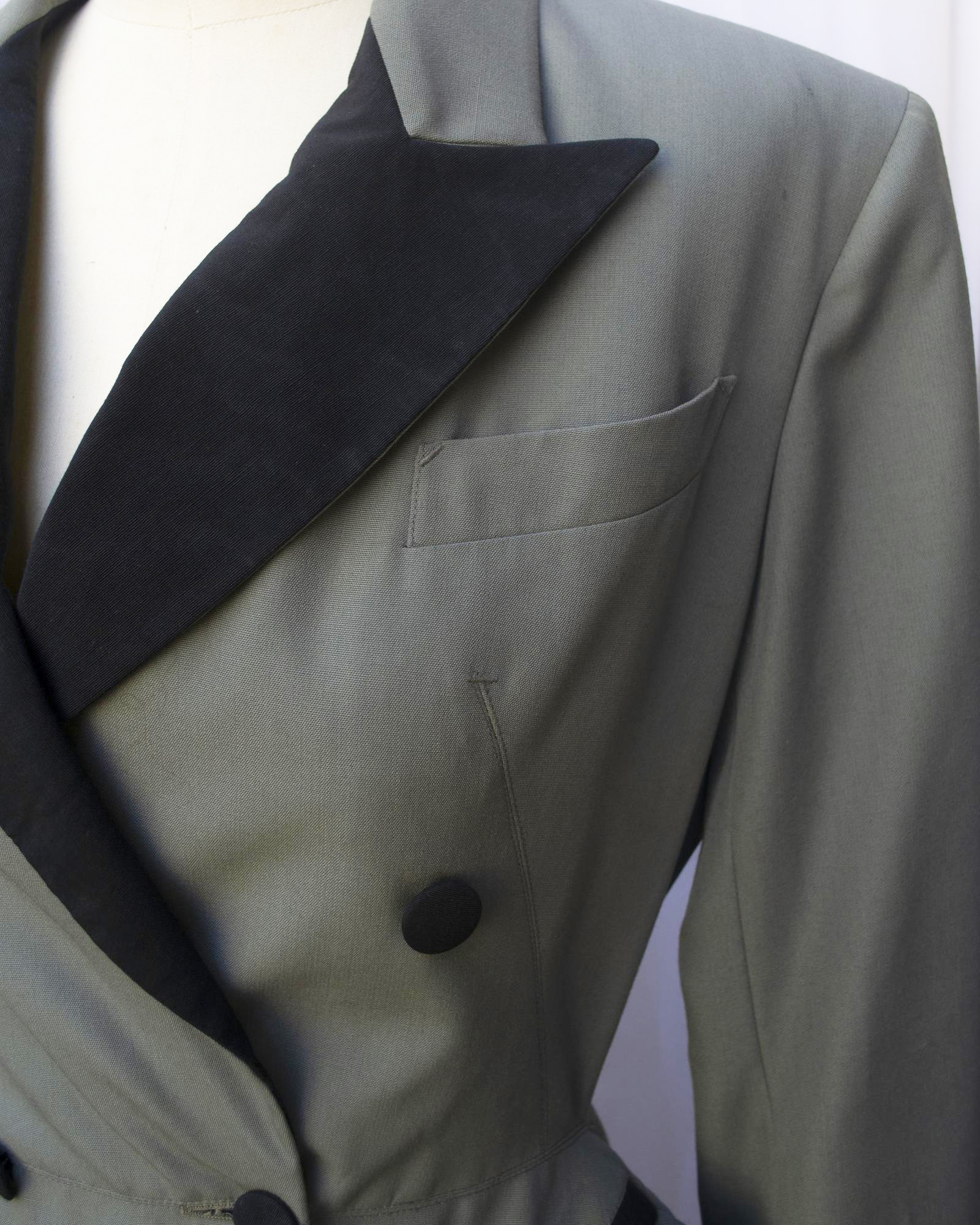 Lined double breasted Dress Coat in grey greenish wool and trimmed and finished in black moire' ottoman and black lining.same moire' fabric covered button. The two button on the back waist support the possibility of buttoned the lenght of the jacket to create other way to wear it. Pockets with flaps. Never worn. From the '80. Made in Italy from Gibo' company. Particularly interesting for collectors. Excellent condition.