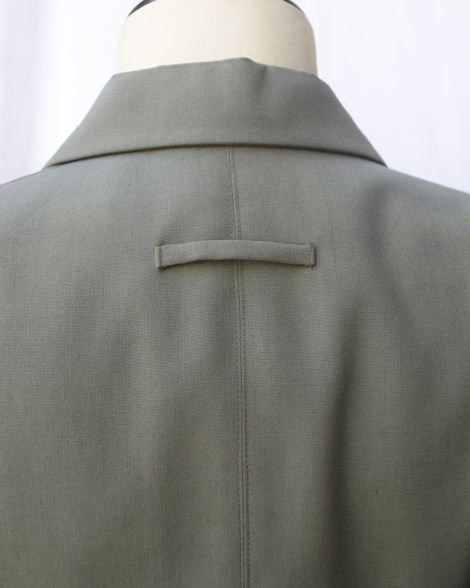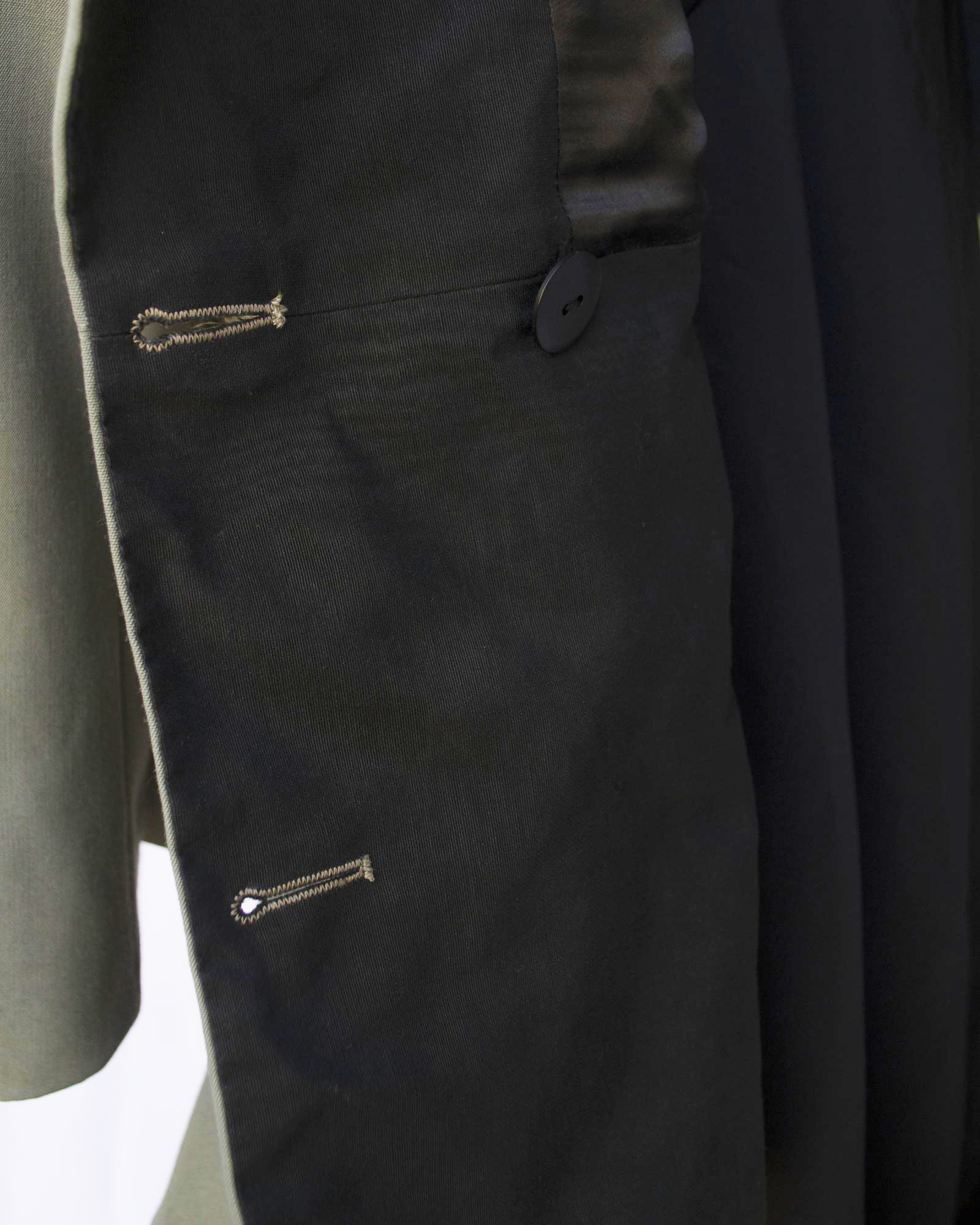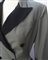 Robe manteau doppiopetto foderato in lana grigio verdastro e bordato e rifinito in tessuto ottoman moire nero e fodera nera. Bottone rivestiti in tessuto moire. I due bottoni sul retro in vita supportano la possibilita' di abbottonare la lunghezza del robe manteau per creare modi diversi di indossarlo. Tasche con patte. Mai indossato. Degli anni '80. Prodotto in Italia dall'azienda Gibo'. Particolarmente interessante per i collezionisti. Eccellente stato.