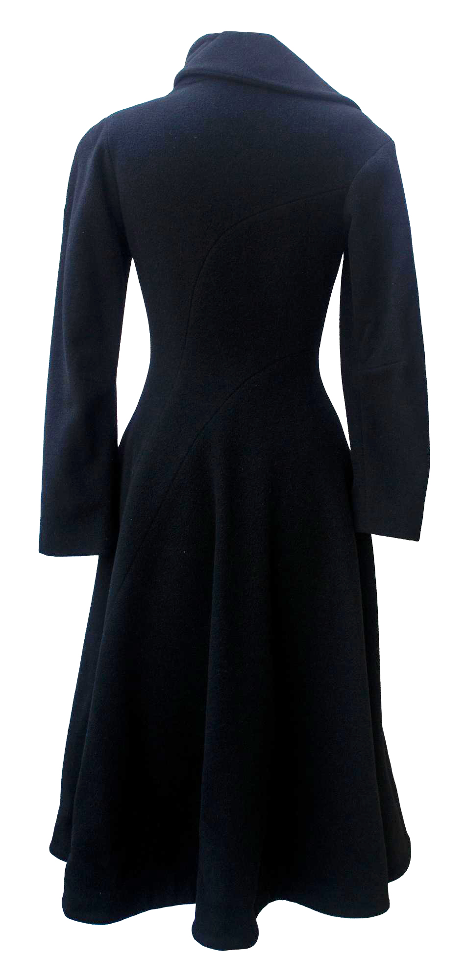 Cappotto redingote in lana cashmere, nero e con fodera jacquard colore beige, con collo asimmetrico e abbottonatura. Bottone Orb logo gigante. Taglia IT 42, degli anni '90. Fatto in Italia. Perfettamente conservato.