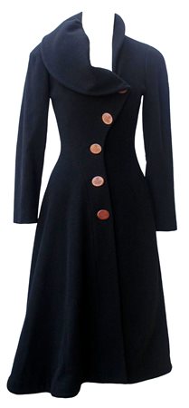 Redingote coat in cashmere wool, black lined with jacquard lining beige color, with asymmetrical collar and buttoning.Giant logo Orb button. Size IT 42, from the '90. Made in Italy. Perfectly preserved.